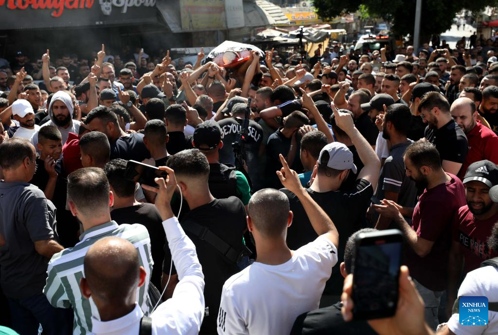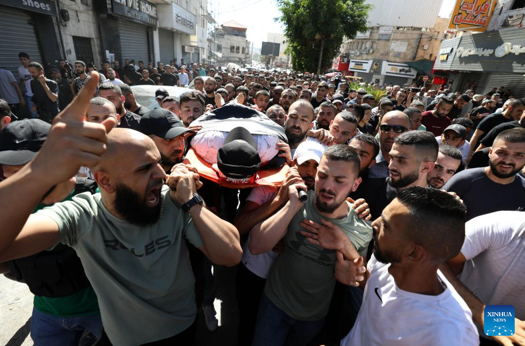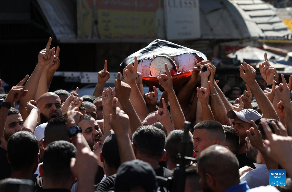 Palestinian mourners carry the body of Nidal Ziad Al-Amer during his funeral after he was killed by Israeli forces in the West Bank city of Jenin, on July 3, 2024. The young Palestinian man in the northern West Bank city of Jenin was killed by Israeli forces on Wednesday, the Palestinian health authorities said. (Photo by Ayman Nobani/Xinhua)