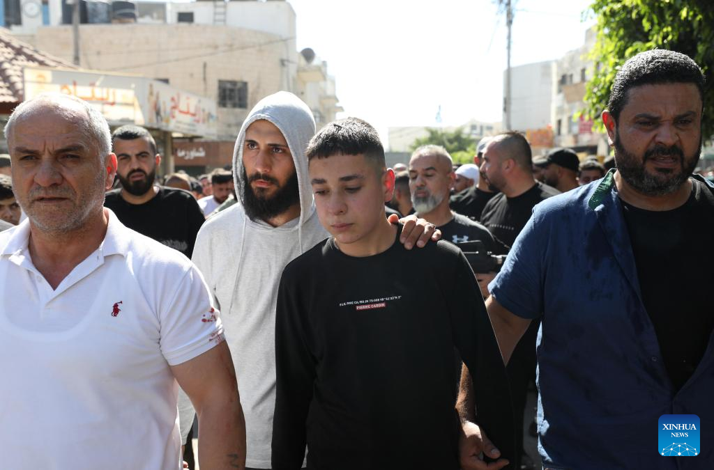 Palestinians mourn Nidal Ziad Al-Amer during his funeral after he was killed by Israeli forces in the West Bank city of Jenin, on July 3, 2024. The young Palestinian man in the northern West Bank city of Jenin was killed by Israeli forces on Wednesday, the Palestinian health authorities said. (Photo by Ayman Nobani/Xinhua)