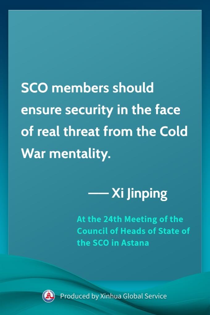 Chinese President Xi Jinping warned of real threats stemming from Cold War mentality at a summit of the Shanghai Cooperation Organization in Astana, calling on SCO members to ensure security in face of such risks.