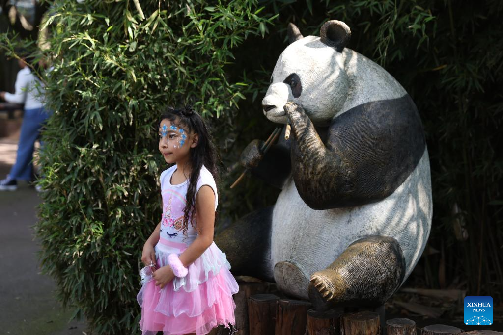 A girl poses for a photo with a giant panda statue at the Chapultepec Zoo in Mexico City, Mexico on July 4, 2024. (Xinhua/Li Mengxin)