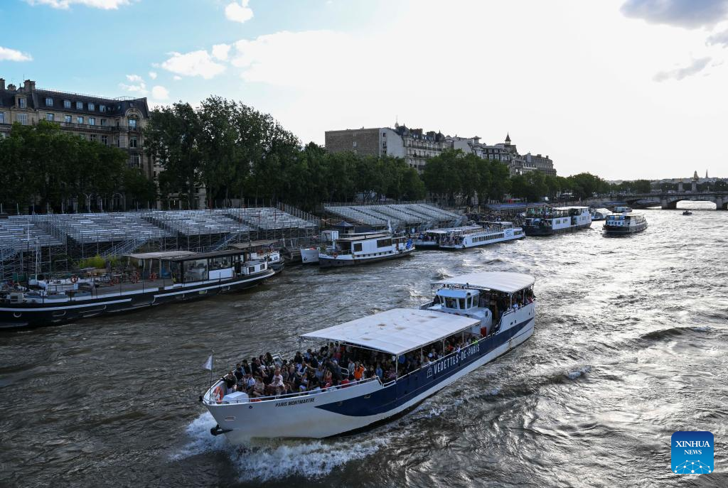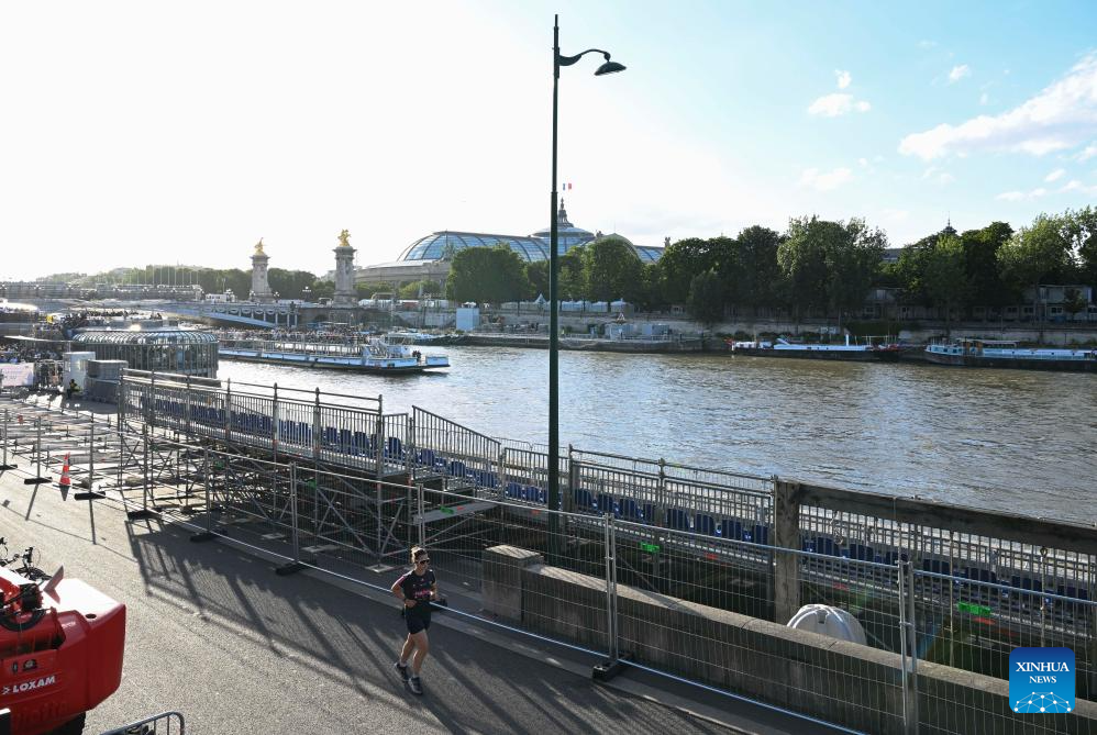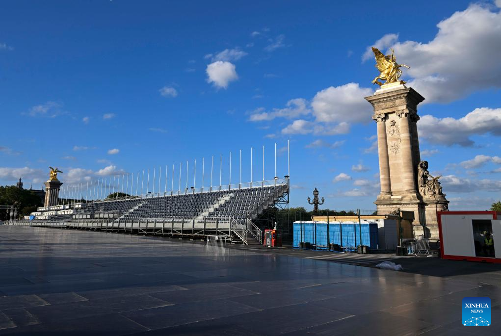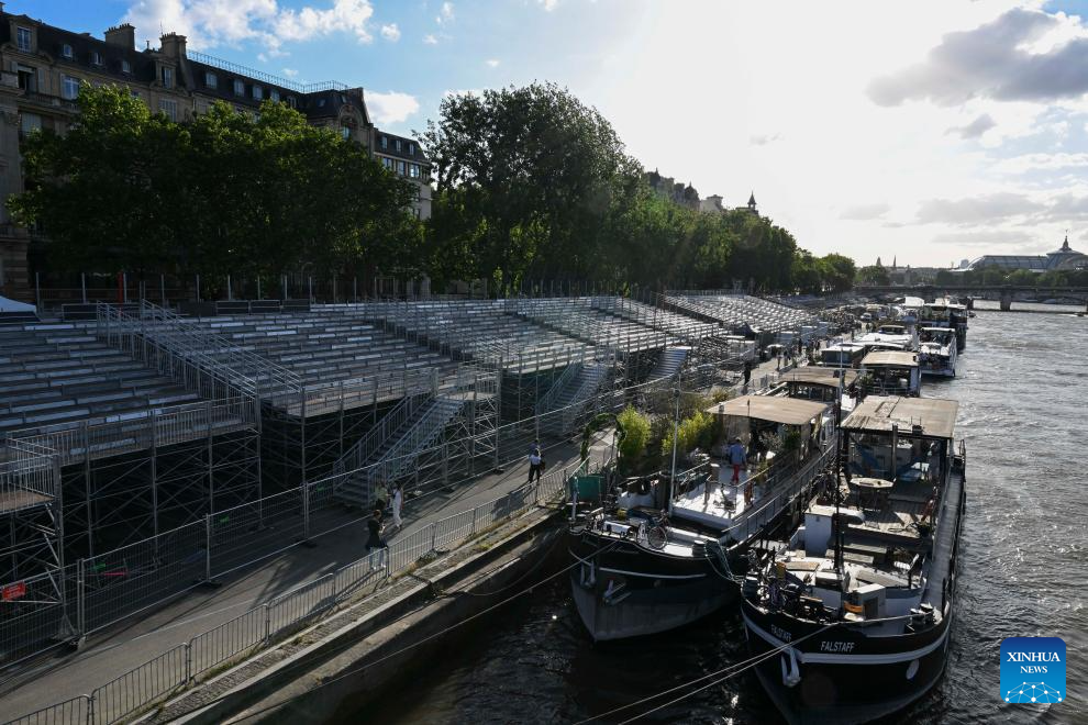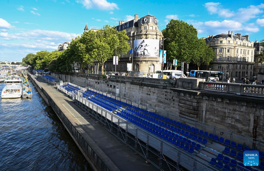 The photo taken on July 4, 2024 shows the spectator stands for the opening ceremony of the 2024 Paris Olympic Games in Paris, France. (Xinhua/He Changshan)