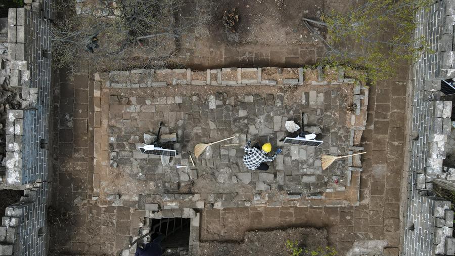 An aerial drone photo taken on April 30, 2024 shows workers working at an archaeological site of a watch tower of the Jiankou section of the Great Wall in Beijing, capital of China. (Xinhua/Chen Zhonghao)
