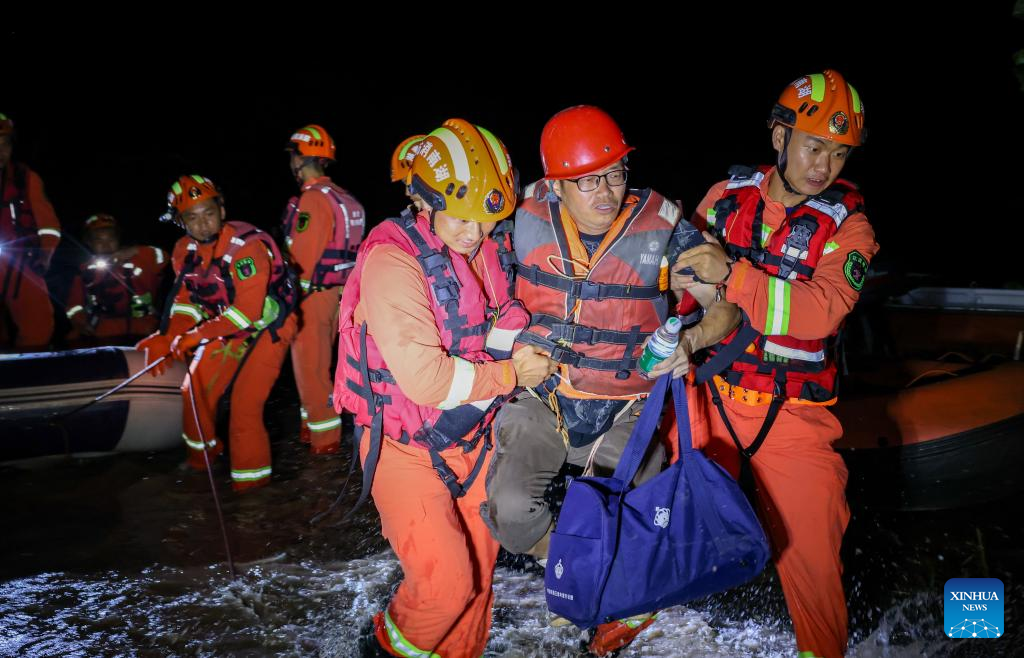 Rescuers transfer stranded residents in Tuanzhou Township, Huarong County under Yueyang City, central China's Hunan Province, July 6, 2024. (Fire and Rescue Department of Hunan/Handout via Xinhua)