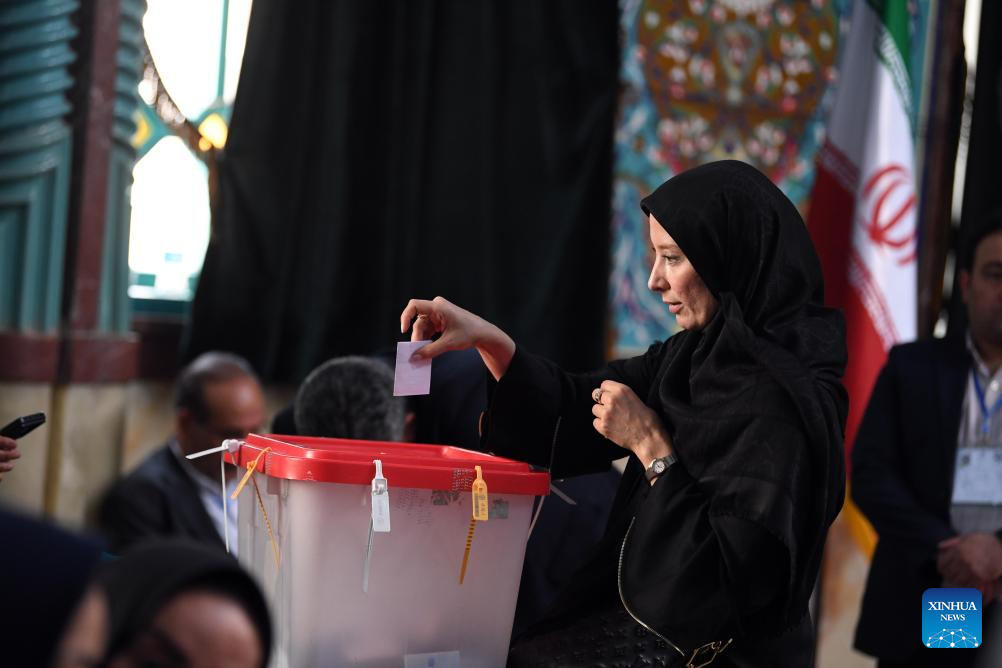A voter casts her ballot at a polling station in Tehran, Iran, July 5, 2024. Masoud Pezeshkian, Iran's former health minister, won the country's 14th presidential election, Iran's Election Headquarters Spokesperson Mohsen Eslami announced on Saturday. Eslami made the announcement while disclosing the results of the runoff held on Friday between reformist Pezeshkian and principlist Saeed Jalili, Iran's former chief negotiator in the nuclear talks with world powers. (Xinhua/Shadati)