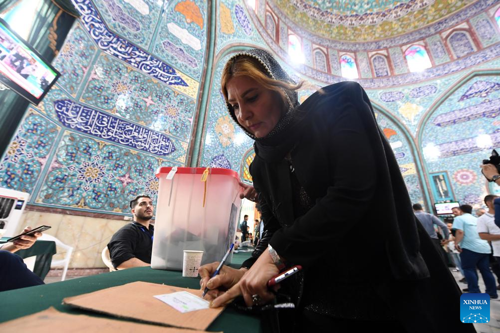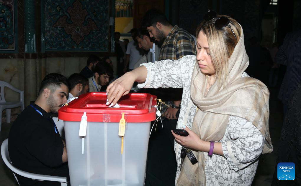 People vote at a polling station in Tehran, Iran, July 5, 2024. Masoud Pezeshkian, Iran's former health minister, won the country's 14th presidential election, Iran's Election Headquarters Spokesperson Mohsen Eslami announced on Saturday. Eslami made the announcement while disclosing the results of the runoff held on Friday between reformist Pezeshkian and principlist Saeed Jalili, Iran's former chief negotiator in the nuclear talks with world powers. (Xinhua/Shadati)