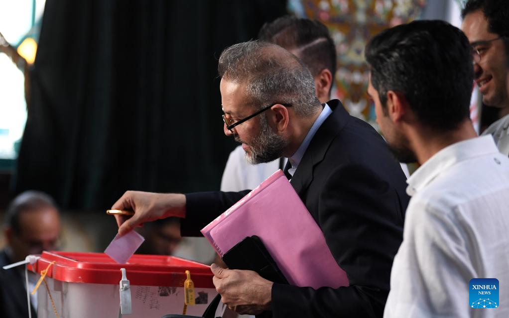 A voter casts his ballot at a polling station in Tehran, Iran, July 5, 2024. Masoud Pezeshkian, Iran's former health minister, won the country's 14th presidential election, Iran's Election Headquarters Spokesperson Mohsen Eslami announced on Saturday. Eslami made the announcement while disclosing the results of the runoff held on Friday between reformist Pezeshkian and principlist Saeed Jalili, Iran's former chief negotiator in the nuclear talks with world powers. (Xinhua/Shadati)