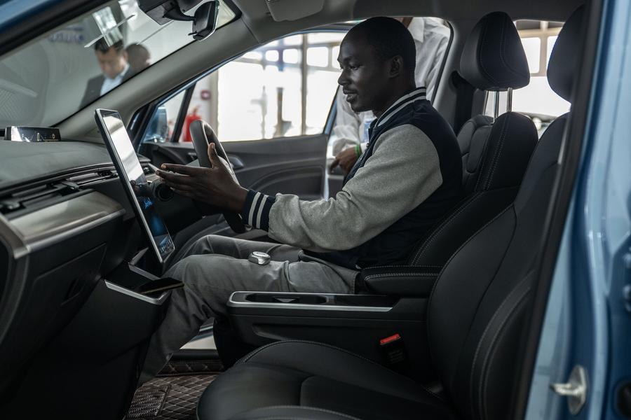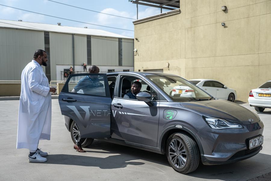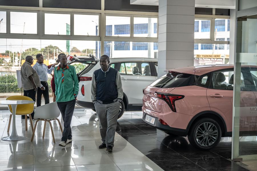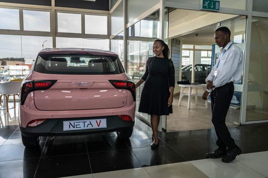 A customer looks at a car at a store of Chinese automotive brand Neta in Nairobi, Kenya, July 5, 2024. (Xinhua/Wang Guansen)Customers prepare for a test drive at a store of Chinese automotive brand Neta in Nairobi, Kenya, July 5, 2024. (Xinhua/Wang Guansen)Customers visit a store of Chinese automotive brand Neta in Nairobi, Kenya, July 5, 2024. (Xinhua/Wang Guansen)■