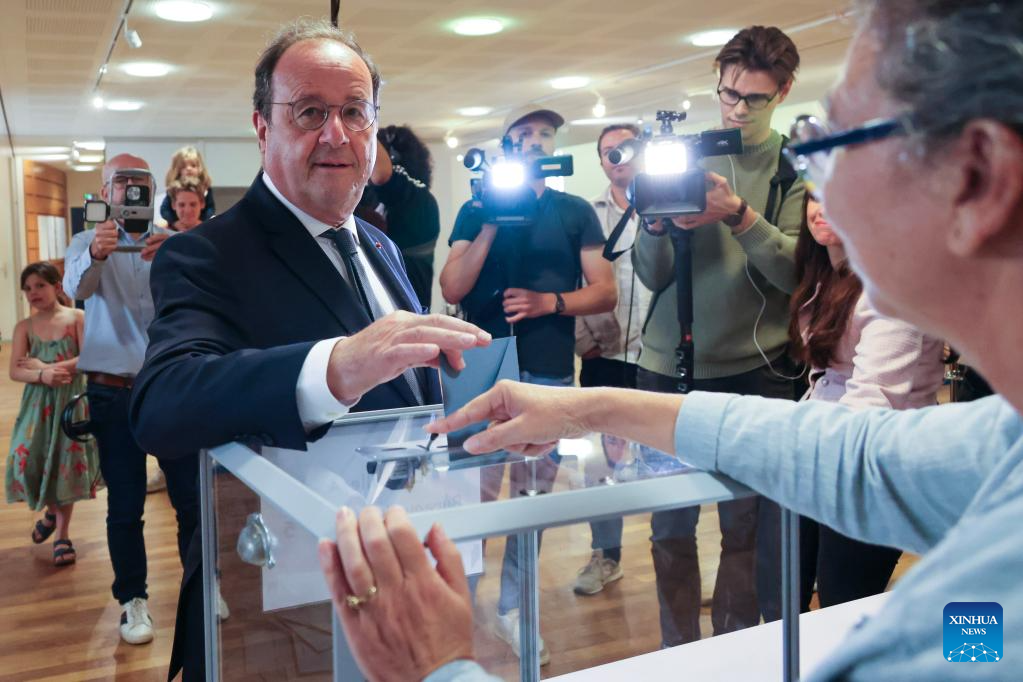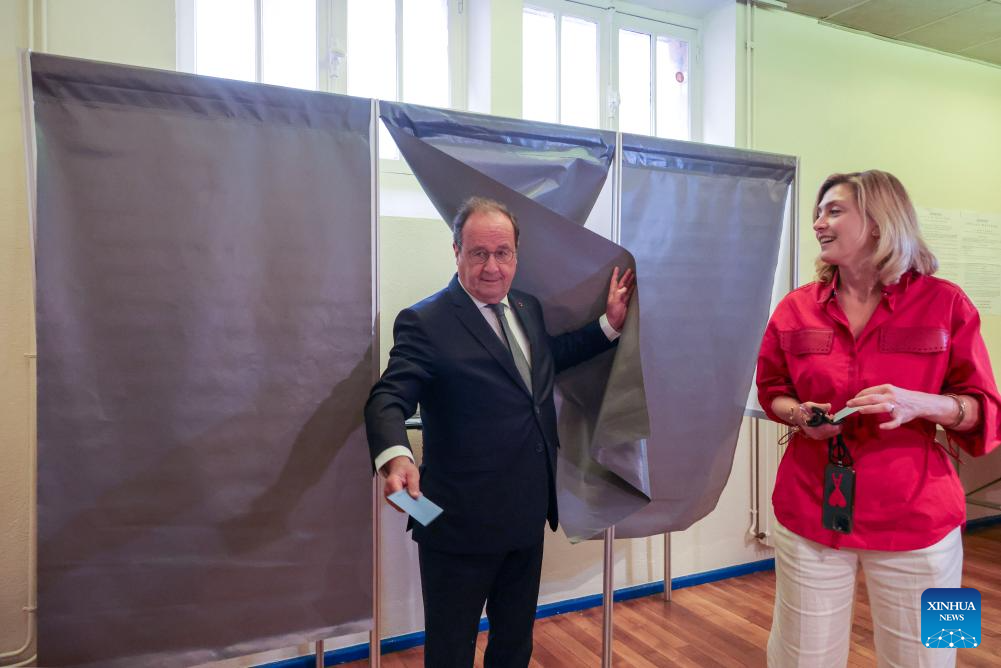 Former French President Francois Hollande casts his ballot at a polling station in Tulle, France, July 7, 2024. The second and decisive round of France's snap legislative elections kicked off Sunday in Metropolitan France for voters to elect the remaining 501 members of the 577-seat French National Assembly. (Photo by Laetitia Notarianni/Xinhua)
