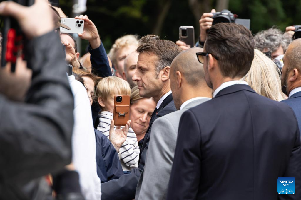 French President Emmanuel Macron communicates with residents after voting at a polling station in Le Touquet, northern France, July 7, 2024. The second and decisive round of France's snap legislative elections kicked off Sunday in Metropolitan France for voters to elect the remaining 501 members of the 577-seat French National Assembly. (Photo by Frank Bonham/Xinhua)