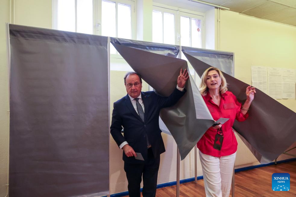 Former French President Francois Hollande and his wife cast their ballots at a polling station in Tulle, France, July 7, 2024. The second and decisive round of France's snap legislative elections kicked off Sunday in Metropolitan France for voters to elect the remaining 501 members of the 577-seat French National Assembly. (Photo by Laetitia Notarianni/Xinhua)