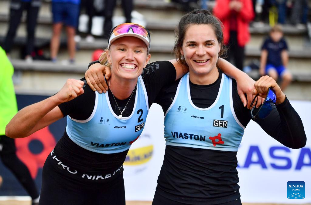 Gold medalists Chenoa Christ (L)/Anna-Lena Grune of Germany celebrate after winning the women's final against Maryna Hladun/Tetiana Lazarenko of Ukraine at the 2024 Volleyball World Beach Pro Tour in Rakvere, Estonia, July 6, 2024. (Photo by Sergei Stepanov/Xinhua)