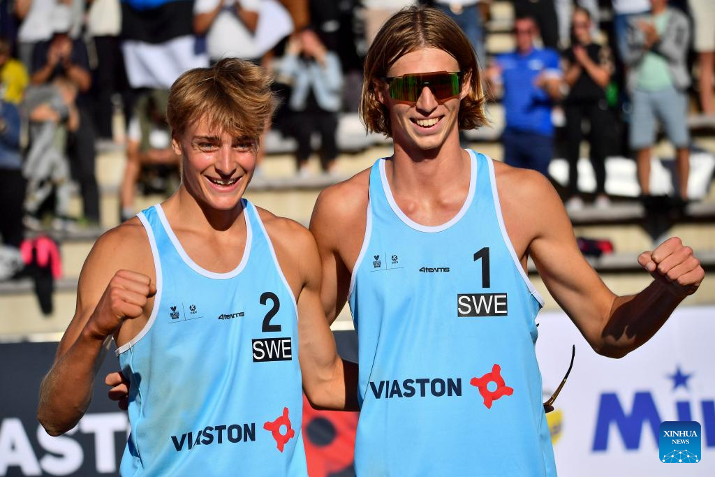 Gold medalists Jacob Holting Nilsson(R)/Elmer Anderssonof of Sweden celebrate after the men's gold medal game against Urmas Piik/Dimitri Korotkov of Estonia at the 2024 Volleyball World Beach Pro Tour in Rakvere, Estonia, July 6, 2024. (Photo by Sergei Stepanov/Xinhua)