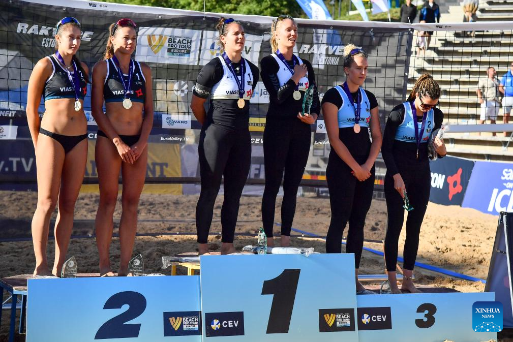 (L to R)Silver medalists Maryna Hladun/Tetiana Lazarenko of Ukraine, gold medalists Anna-Lena Grune/Chenoa Christ of Germany and bronze medalists Gerda Grudzinskaite/Rugile Grudzinskaite of Lithuania pose during the awarding ceremony for the women's event at the 2024 Volleyball World Beach Pro Tour in Rakvere, Estonia, July 6, 2024. (Photo by Sergei Stepanov/Xinhua)