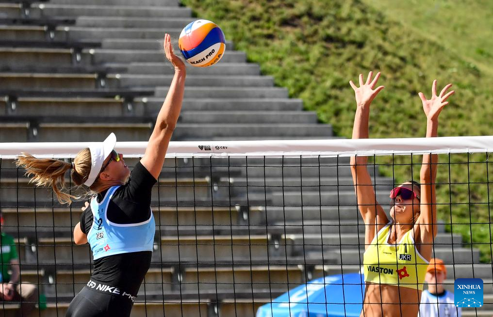 Chenoa Christ (L) of Germany competes against Maryna Hladun of Ukraine during the women's gold medal game between Chenoa Christ/Anna-Lena Grune of Germany and Maryna Hladun/Tetiana Lazarenko of Ukraine at the 2024 Volleyball World Beach Pro Tour in Rakvere, Estonia, July 6, 2024. (Photo by Sergei Stepanov/Xinhua)