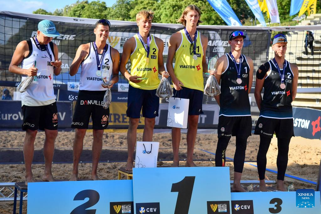 (L to R)Silver medalists Urmas Piik/Dimitri Korotkov of Estonia, gold medalists Jacob Holting Nilsson/Elmer Anderssonof of Sweden and bronze medalists Robin Sowa/Maximilian Just of Germany pose during the awarding ceremony for the men's event at the 2024 Volleyball World Beach Pro Tour in Rakvere, Estonia, July 6, 2024. (Photo by Sergei Stepanov/Xinhua)