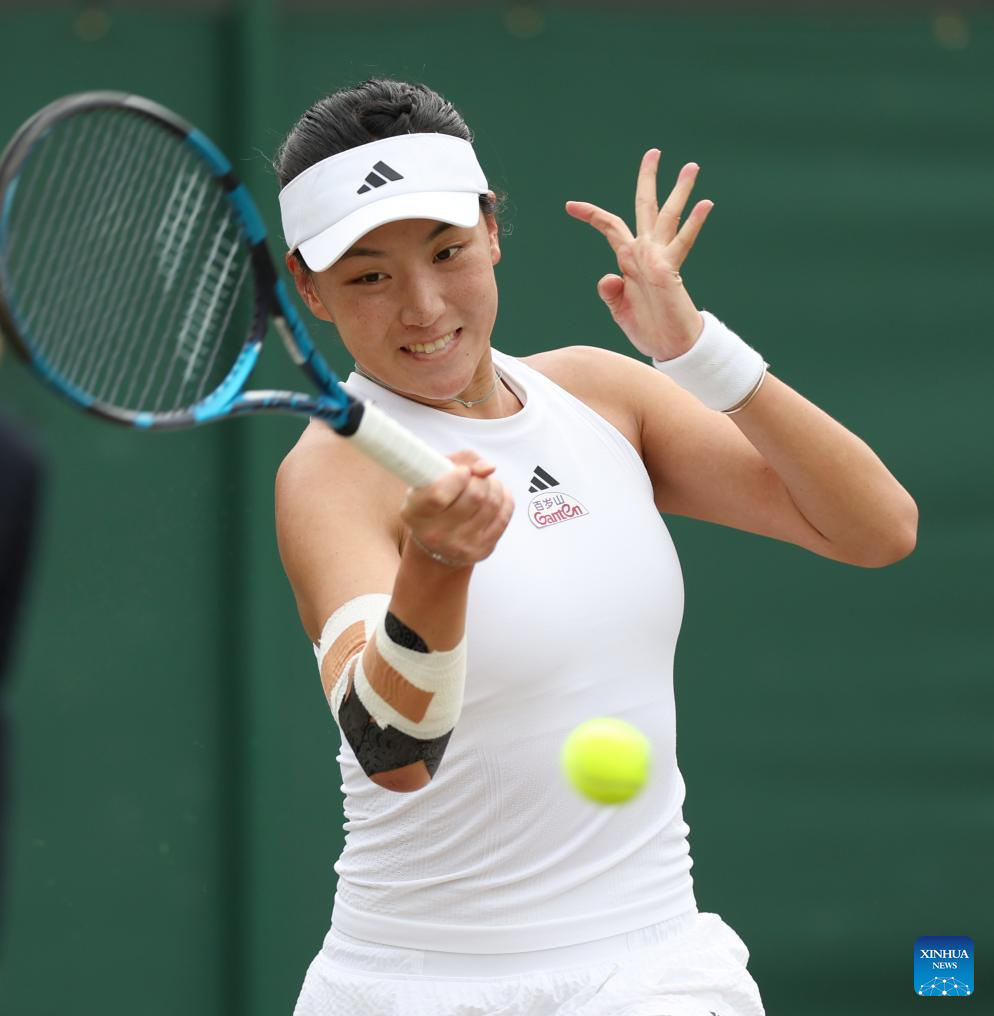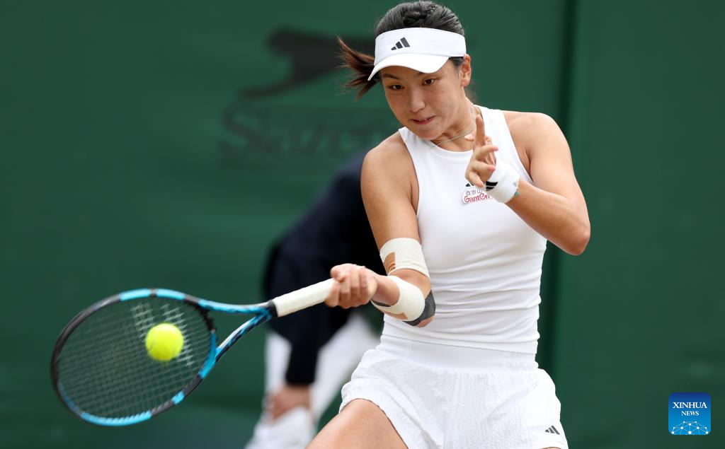 Wang Xinyu of China hits a return during the women's singles 4th round match between Elina Svitolina of Ukraine and Wang Xinyu of China at Wimbledon tennis Championship in London, Britain, on July 8, 2024. (Xinhua/Li Ying)