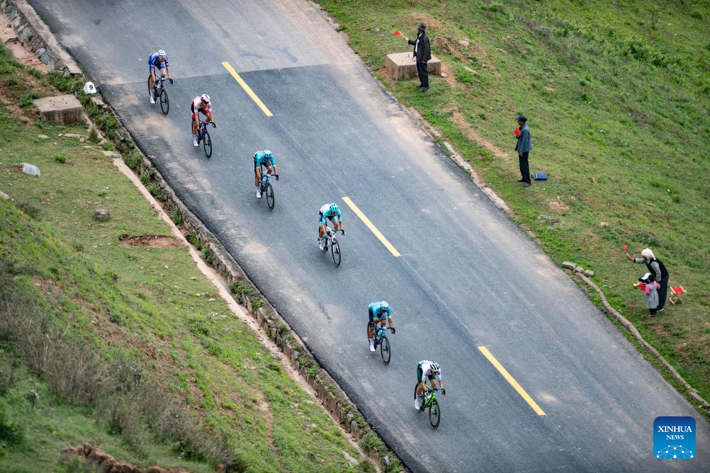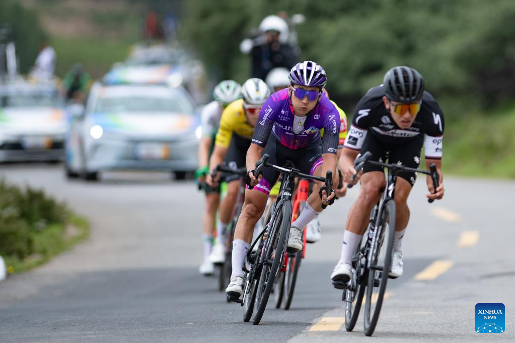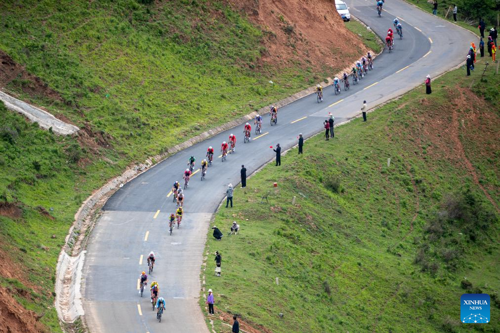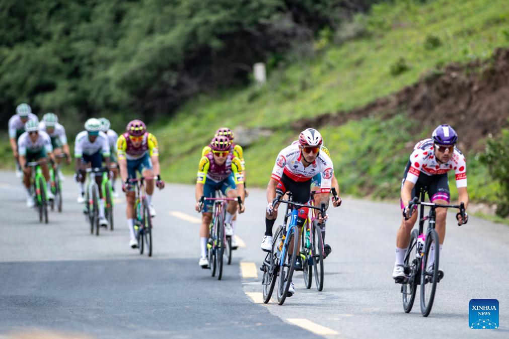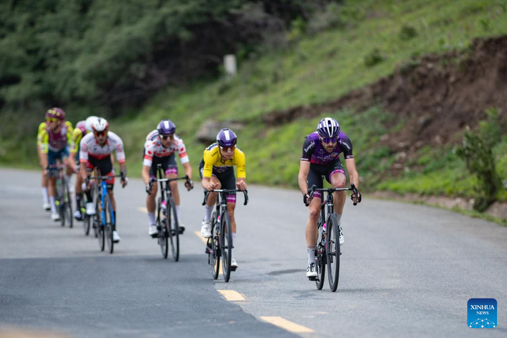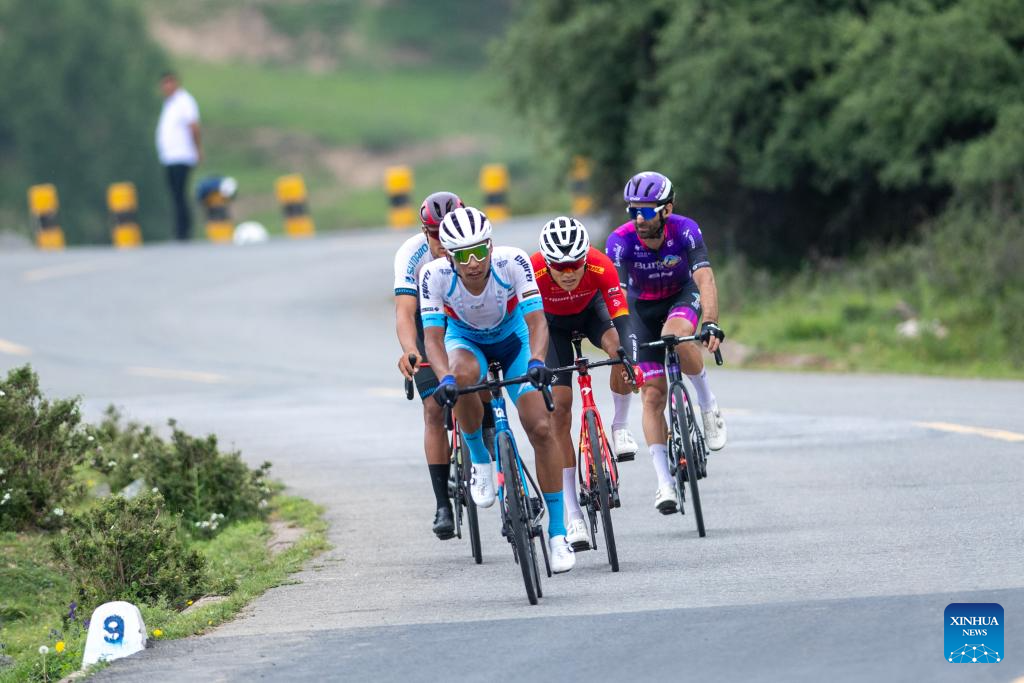 Cyclists compete during the stage 3 of the 23rd Tour of Qinghai Lake cycling race from Huzhu to Guide, northwest China's Qinghai Province, July 9, 2023. (Photo by Pan Binbin/Xinhua)