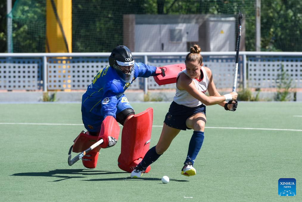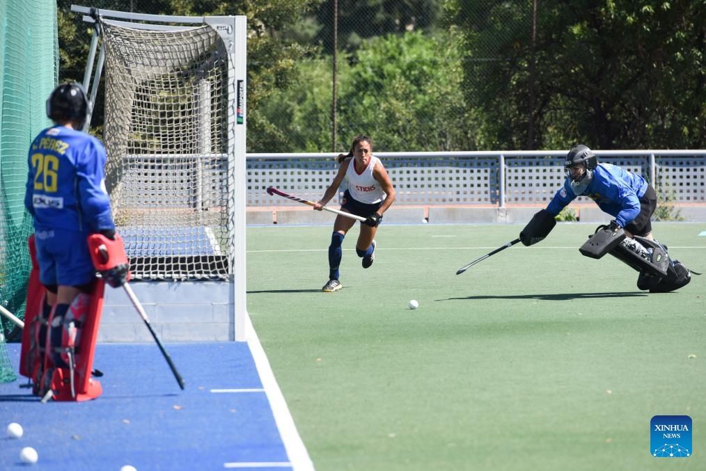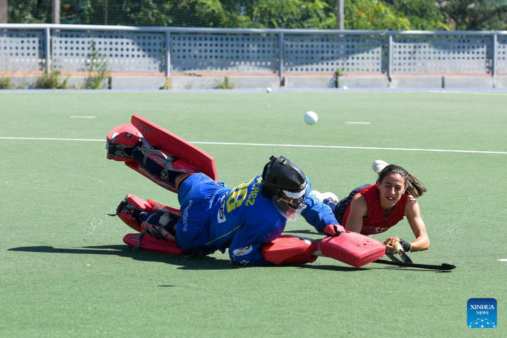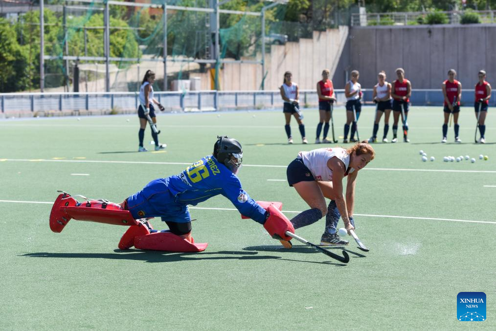 Players of Spanish women's field hockey team attend a training session to prepare for their participation at the Paris Olympic Games, at the Madrid High Performance Center, in Madrid, Spain, July 9, 2024. (Photo by Gustavo Valiente/Xinhua)