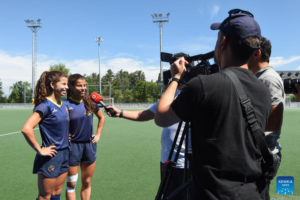 Spanish field hockey player and twin sisters Sara Barrios (1st L) and Laura Barrios are interviewed during the Media Day of Spanish women's field hockey team at the Madrid High Performance Center, in Madrid, Spain, July 9, 2024. (Photo by Gustavo Valiente/Xinhua)