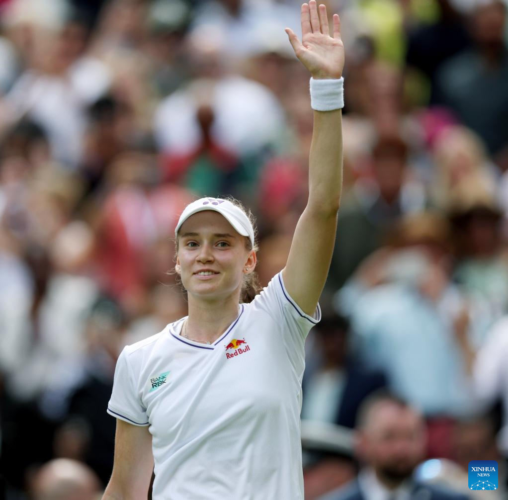 Elena Rybakina celebrates after winning the women's singles quarterfinal match between Elena Rybakina of Kazakhstan and Elina Svitolina of Ukraine at Wimbledon tennis Championship in London, Britain, July 10, 2024. (Xinhua/Li Ying)