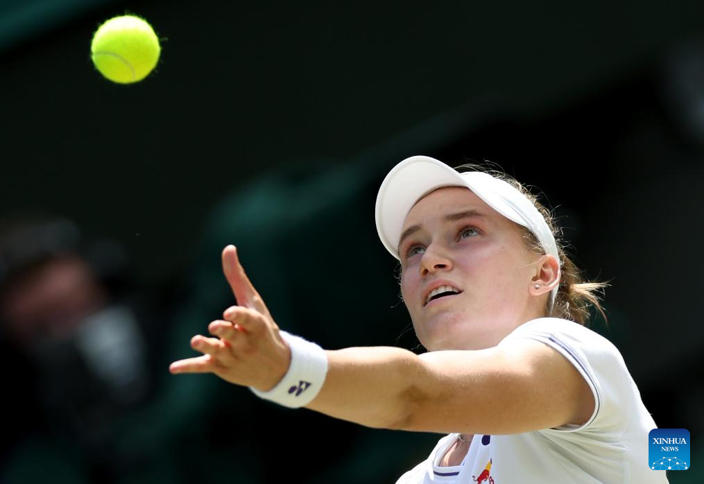 Elena Rybakina serves during the women's singles quarterfinal match between Elena Rybakina of Kazakhstan and Elina Svitolina of Ukraine at Wimbledon tennis Championship in London, Britain, July 10, 2024. (Xinhua/Li Ying)
