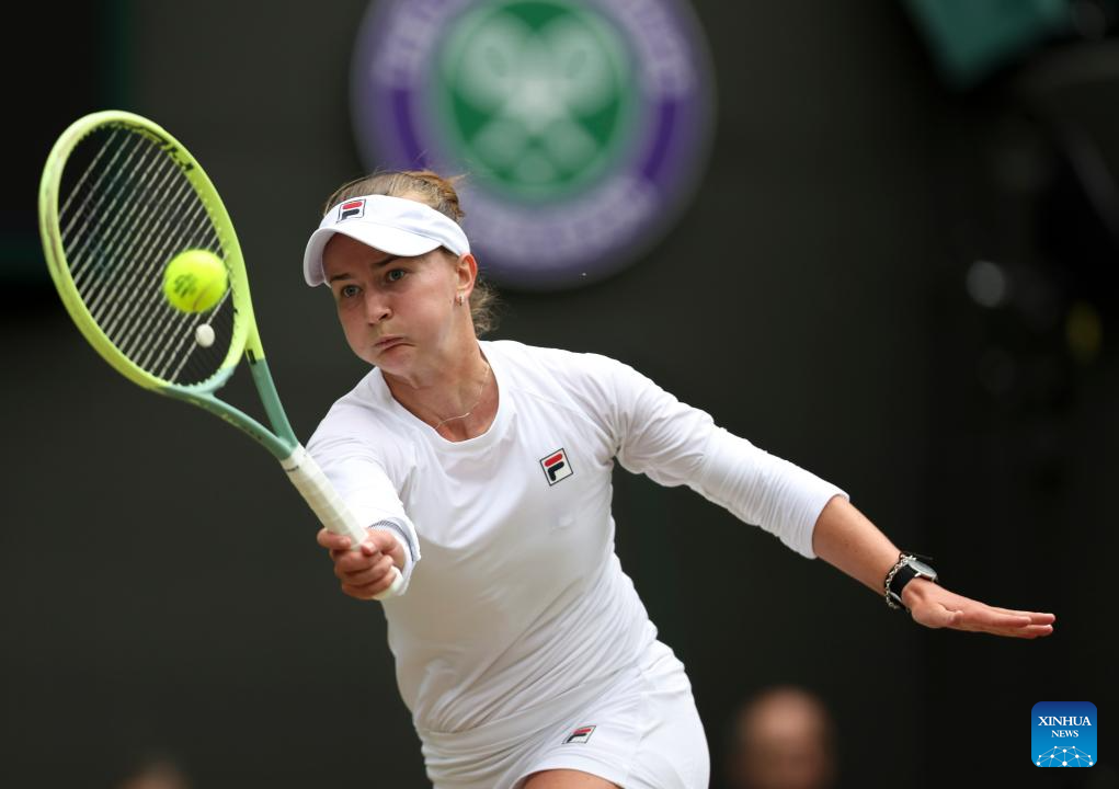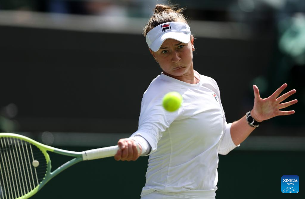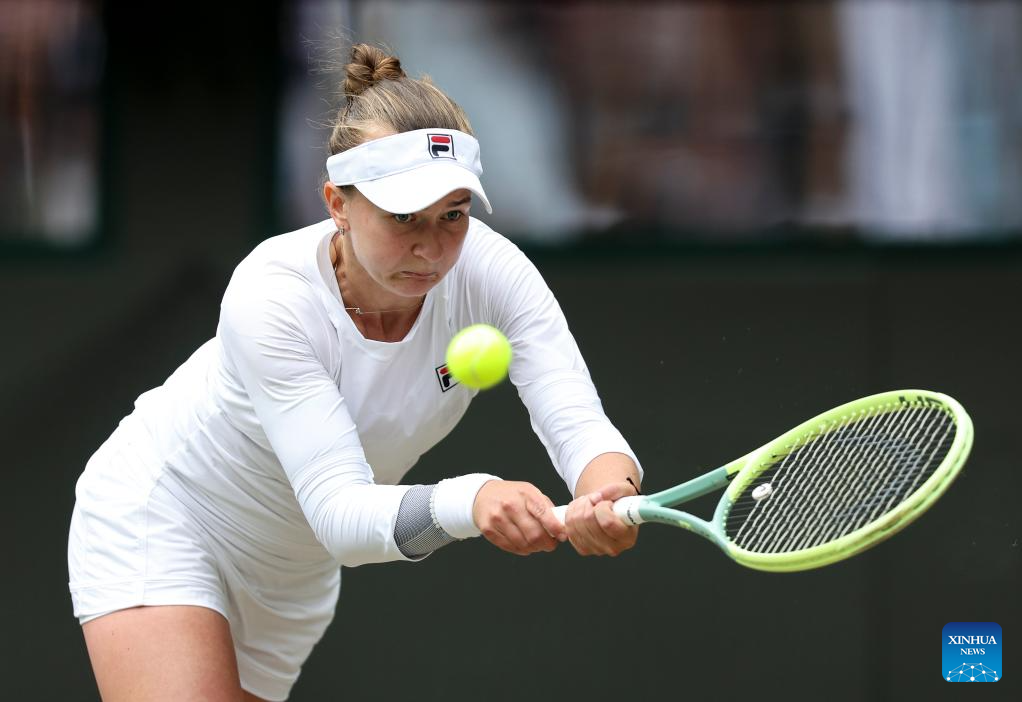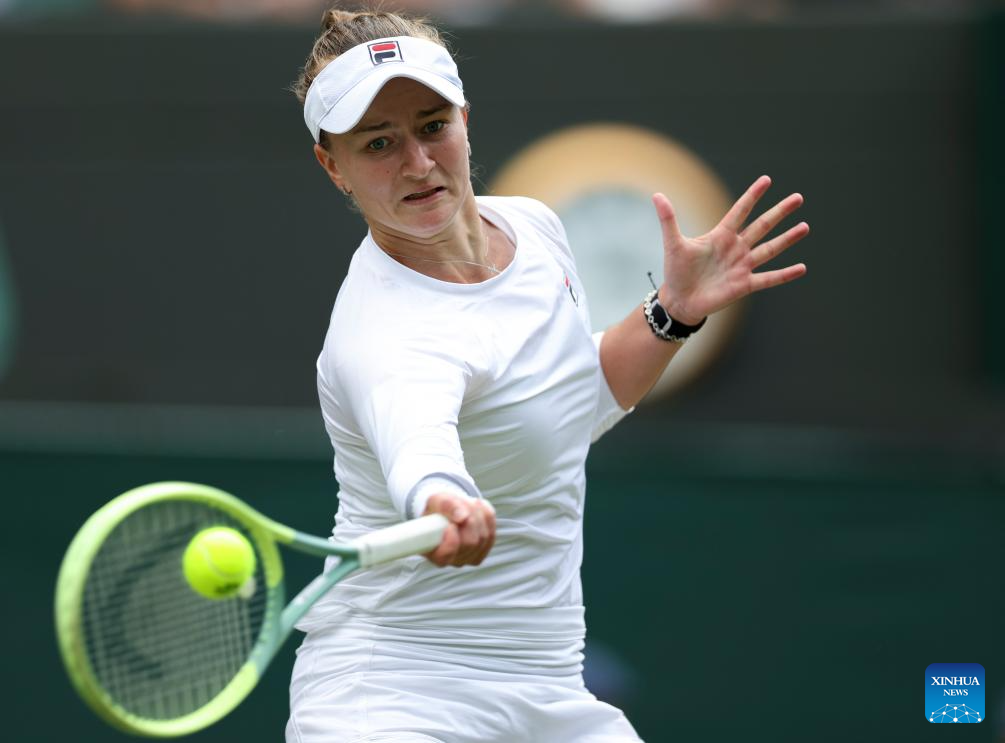 Barbora Krejcikova of the Czech Republic hits a return during the women's singles quarterfinal between Jelena Ostapenko of Latvia and Barbora Krejcikova of the Czech Republic at Wimbledon tennis Championship in London, Britain, on July 10, 2024. (Xinhua/Han Yan)
