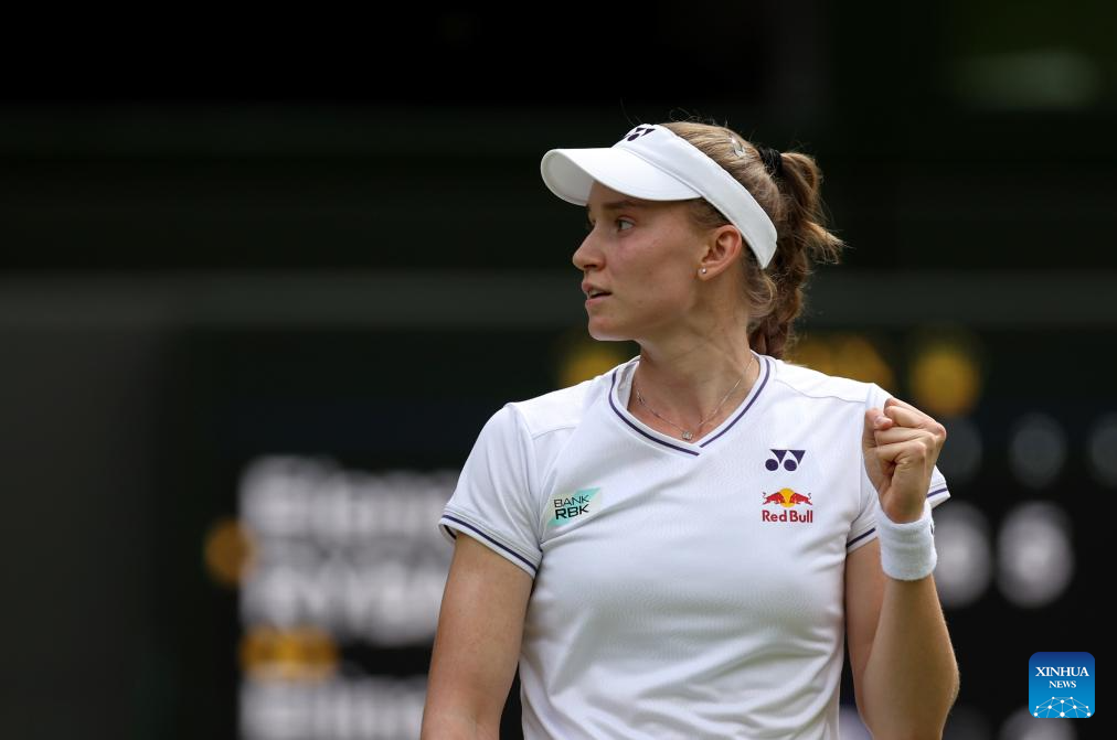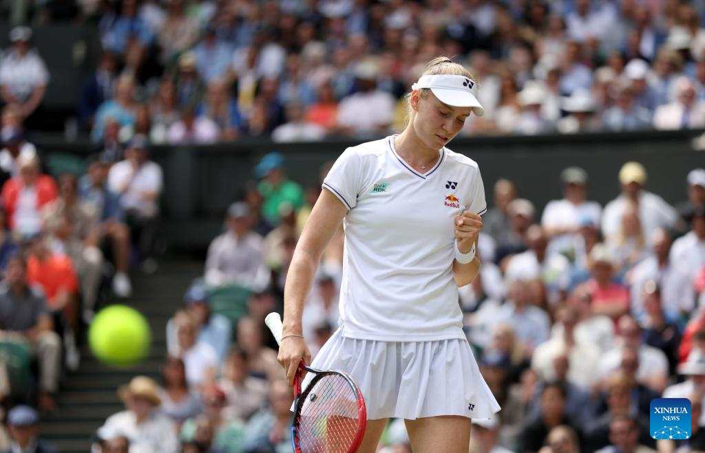 Elena Rybakina reacts during the women's singles quarterfinal match between Elena Rybakina of Kazakhstan and Elina Svitolina of Ukraine at Wimbledon tennis Championship in London, Britain, July 10, 2024. (Xinhua/Li Ying)