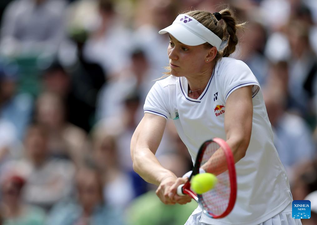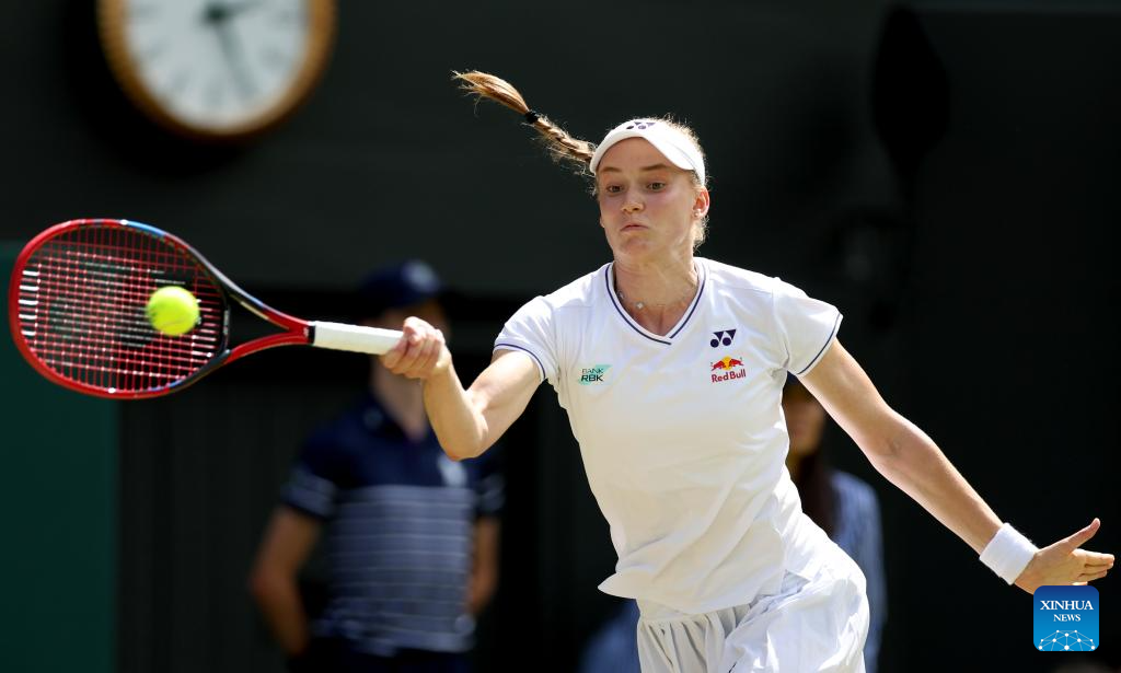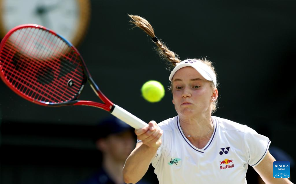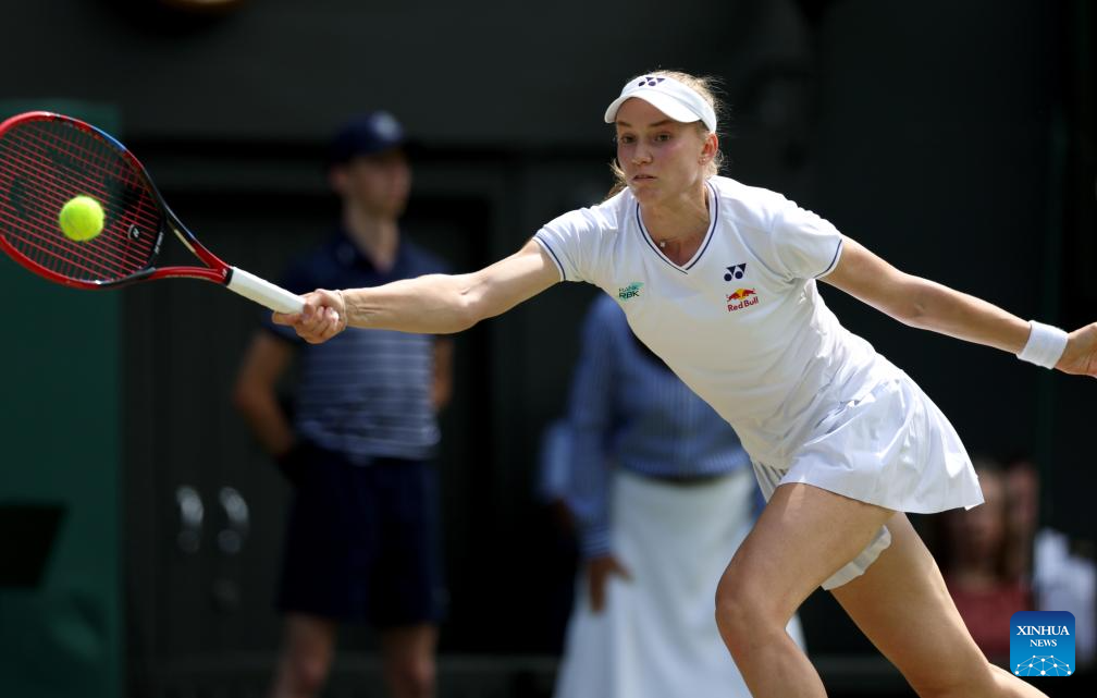 Elena Rybakina hits a return during the women's singles quarterfinal match between Elena Rybakina of Kazakhstan and Elina Svitolina of Ukraine at Wimbledon tennis Championship in London, Britain, July 10, 2024. (Xinhua/Li Ying)