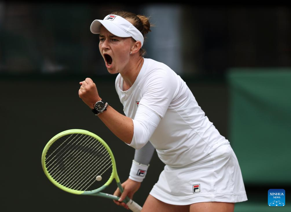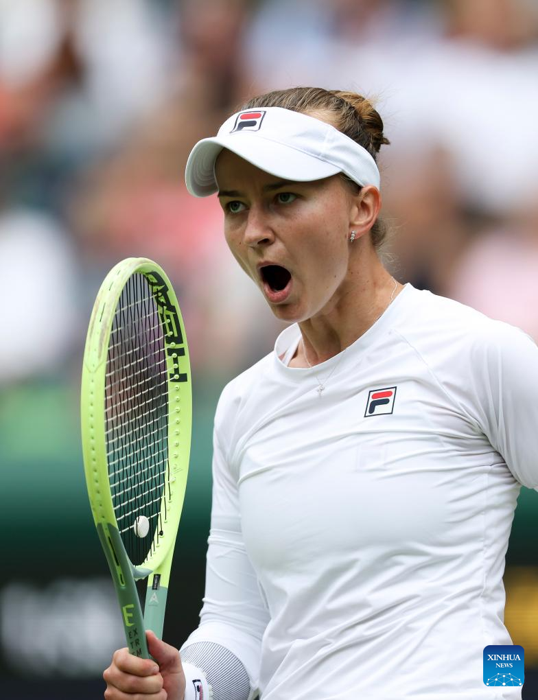 Barbora Krejcikova of the Czech Republic reacts during the women's singles quarterfinal between Jelena Ostapenko of Latvia and Barbora Krejcikova of the Czech Republic at Wimbledon tennis Championship in London, Britain, on July 10, 2024. (Xinhua/Han Yan)