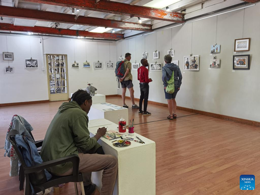 Artists draw paintings during an exhibition titled "Save us from Fading" in Windhoek, Namibia, on July 11, 2024. Namibian artists are taking a stand for wildlife protection through an exhibition at the Omba Art Gallery in Windhoek, the capital of Namibia. (Photo by Ndalimpinga Iita/Xinhua)