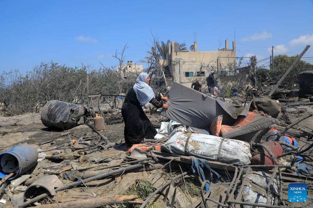 A woman checks the debris after an Israeli airstrike in the Mawasi area of the southern Gaza Strip city of Khan Younis, July 13, 2024. At least 71 Palestinians were killed and 289 others injured on Saturday by an Israeli airstrike that attacked tents of displaced people in the Mawasi area of the Khan Younis city in the south of Gaza, the Gaza health authorities said. (Photo by Rizek Abdeljawad/Xinhua)