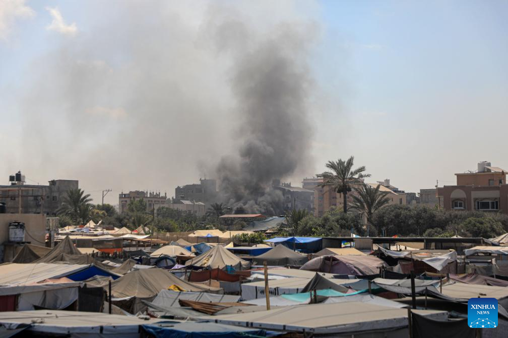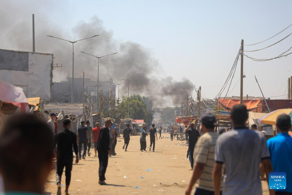 This photo taken on July 13, 2024 shows smoke rising following an Israeli airstrike in the Mawasi area of the southern Gaza Strip city of Khan Younis. At least 71 Palestinians were killed and 289 others injured on Saturday by an Israeli airstrike that attacked tents of displaced people in the Mawasi area of the Khan Younis city in the south of Gaza, the Gaza health authorities said. (Photo by Rizek Abdeljawad/Xinhua)