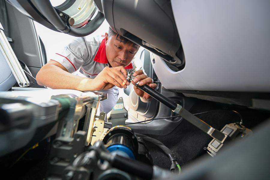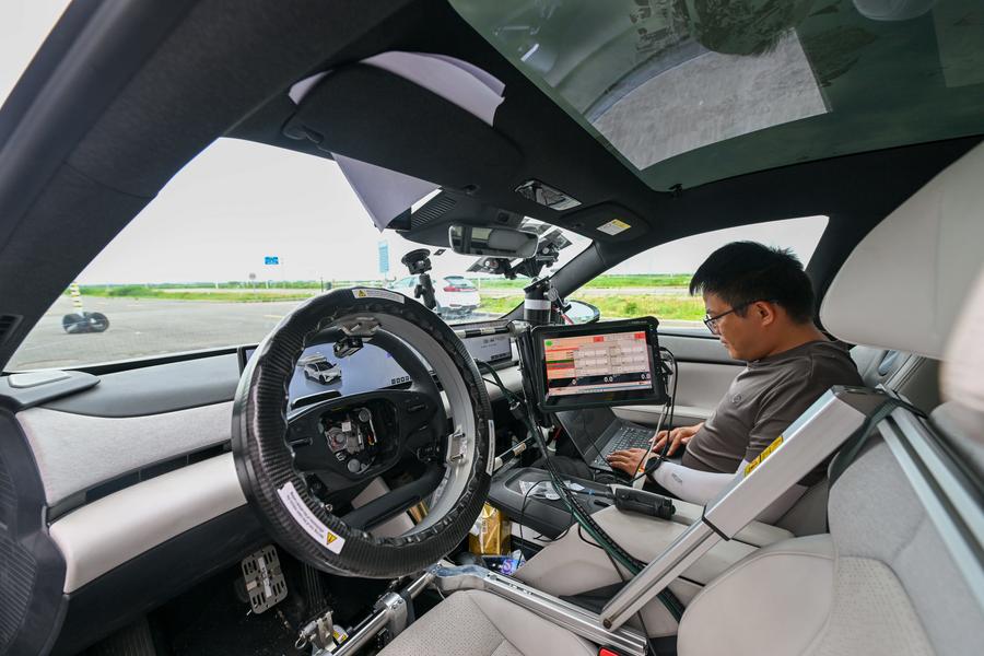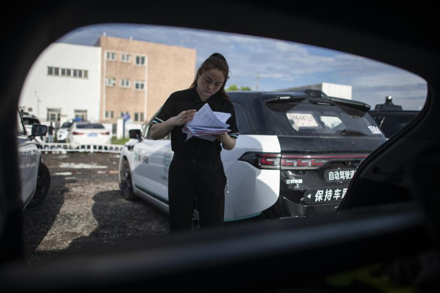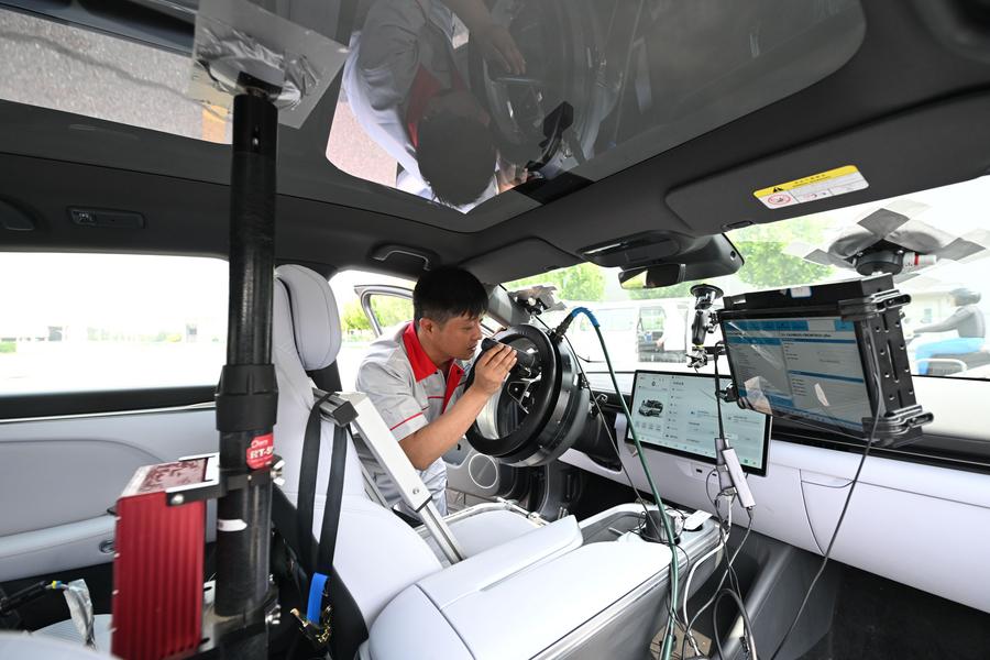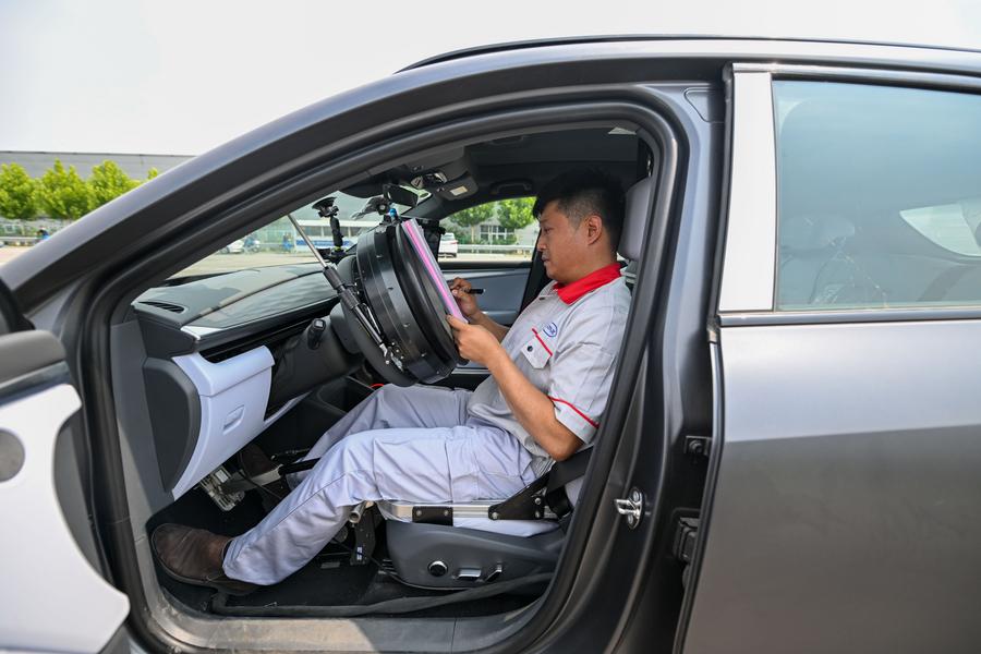 Intelligent connected vehicle tester Zhang Cheng conducts tests in an intelligent connected vehicle at an automobile inspection center in Tianjin, north China, June 19, 2024. (Xinhua/Sun Fanyue)Intelligent connected vehicle tester Zhang Cheng records the test data of an intelligent connected vehicle at an automobile inspection center in Tianjin, north China, June 19, 2024. (Xinhua/Sun Fanyue)Intelligent connected vehicle tester Zhang Cheng prepares the test report of an intelligent connected vehicle in Tianjin, north China, June 19, 2024. (Xinhua/Sun Fanyue)Intelligent connected vehicle tester Zhang Cheng installs a braking robot in an intelligent connected vehicle before a test at an automobile inspection center in Tianjin, north China, June 19, 2024. (Xinhua/Sun Fanyue)Intelligent connected vehicle tester Zhang Cheng installs a steering robot in an intelligent connected vehicle before a test at an automobile inspection center in Tianjin, north China, June 19, 2024. (Xinhua/Sun Fanyue)Intelligent connected vehicle tester Zhang Cheng (R) and his colleague Zhang Shuai conduct tests in an intelligent connected vehicle at an automobile inspection center in Tianjin, north China, June 19, 2024. (Xinhua/Sun Fanyue)An aerial drone photo taken on July 4, 2024 shows an intelligent connected vehicle during a road test in Wuhan, central China's Hubei Province, July 4, 2024. (Xinhua/Wu Zhizun)Intelligent connected vehicle tester Li Cheng is pictured during a road test in Wuhan, central China's Hubei Province, July 4, 2024. (Xinhua/Wu Zhizun)Intelligent connected vehicle tester Li Cheng checks a vehicle after a road test in Wuhan, central China's Hubei Province, July 4, 2024. (Xinhua/Wu Zhizun)Intelligent connected vehicle tester Li Cheng (back row) gives a lesson to new employees in Wuhan, central China's Hubei Province, July 4, 2024. (Xinhua/Wu Zhizun)Intelligent connected vehicle tester Li Cheng checks a vehicle before a road test in Wuhan, central China's Hubei Province, July 4, 2024. (Xinhua/Wu Zhizun)Intelligent connected vehicle tester Li Cheng is pictured in Wuhan, central China's Hubei Province, July 4, 2024. (Xinhua/Wu Zhizun)Intelligent connected vehicle tester Wang Juan prepares for a road test in Wuhan, central China's Hubei Province, July 4, 2024. (Xinhua/Wu Zhizun)Wang Juan, an intelligent connected vehicle tester, poses for a photo in Wuhan, central China's Hubei Province, July 4, 2024. (Xinhua/Wu Zhizun)Intelligent connected vehicle tester Wang Juan is pictured during a road test in Wuhan, central China's Hubei Province, July 4, 2024. (Xinhua/Wu Zhizun)Intelligent connected vehicle tester Wang Juan (L) gives a road test training to a new employee in Wuhan, central China's Hubei Province, July 4, 2024. (Xinhua/Wu Zhizun)Intelligent connected vehicle tester Wang Juan prepares for a road test in Wuhan, central China's Hubei Province, July 4, 2024. (Xinhua/Wu Zhizun)Intelligent connected vehicle tester Wang Juan adjusts a rearview mirror before a road test in Wuhan, central China's Hubei Province, July 4, 2024. (Xinhua/Wu Zhizun)Staff members pose for a group photo at National Intelligent and Connected Vehicle Quality Inspection and Testing Center (Tianjin) in Tianjin, north China, June 19, 2024. (Xinhua/Sun Fanyue)Intelligent connected vehicle testers measure the distance between an intelligent connected vehicle and a scooter during a door-opening reminder test at an enclosed test field in Tianjin, north China, June 14, 2024. (Xinhua/Sun Fanyue)An intelligent connected vehicle conducts autonomous emergency braking test at an enclosed test field in Tianjin, north China, June 19, 2024. (Xinhua/Sun Fanyue)An intelligent connected vehicle tester works before a test at an enclosed test field in Tianjin, north China, June 14, 2024. (Xinhua/Sun Fanyue)■