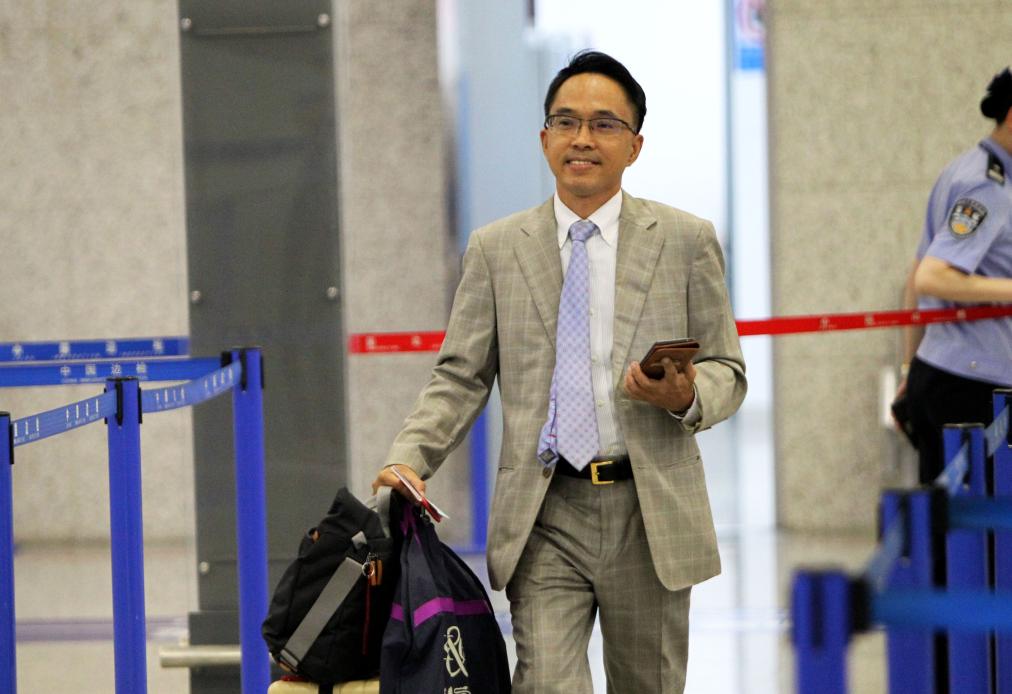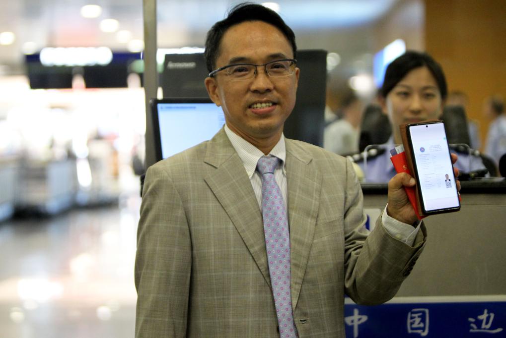 A man surnamed Chung from Singapore presents an e-visa issued by the Government Affairs of Exit-Entry Administration Bureau of the Shanghai Public Security Bureau at the Shanghai Pudong International Airport in Shanghai, east China, July 12, 2024. (Xinhua/Wang Xiang)