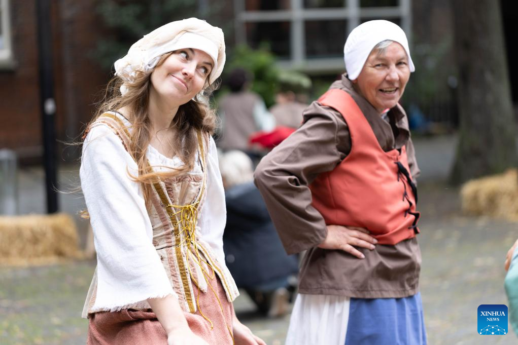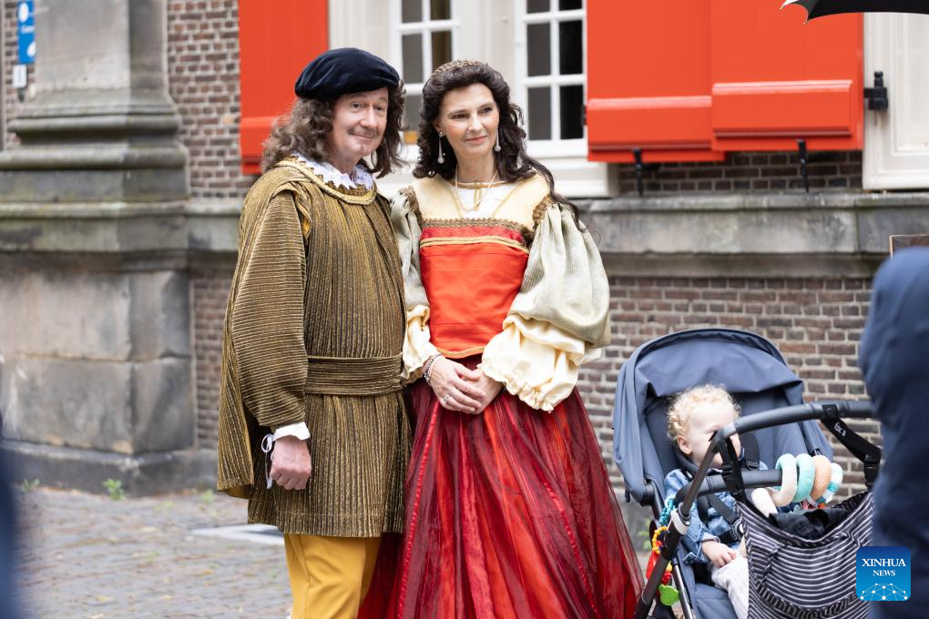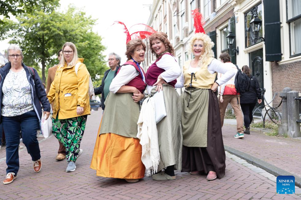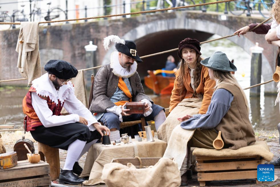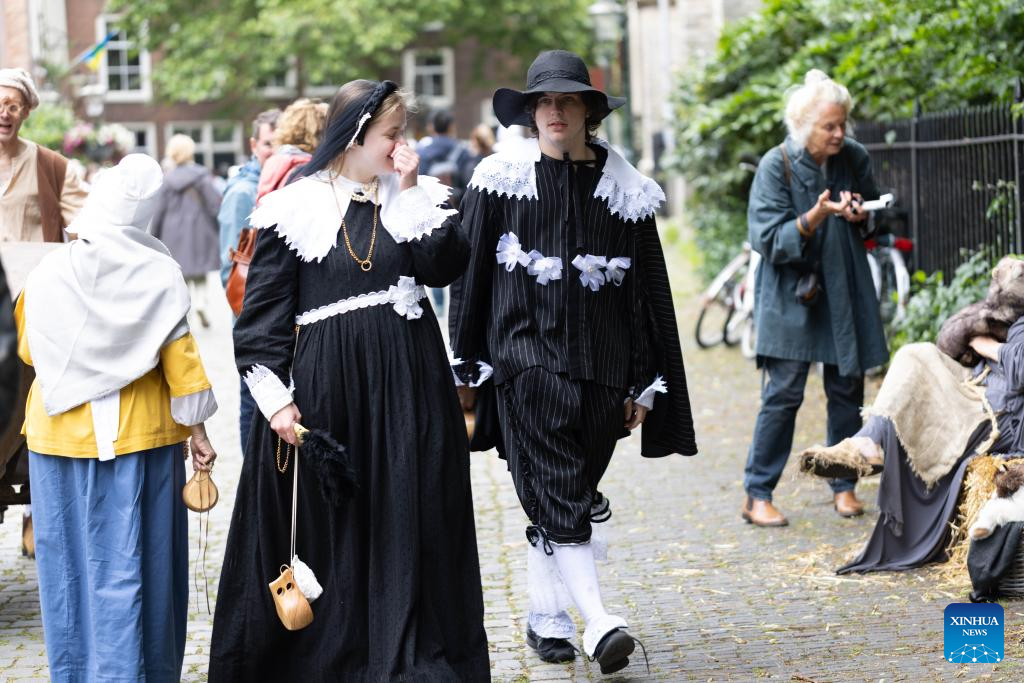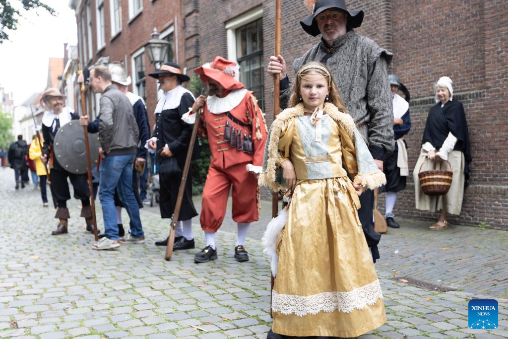 During the two-day event, the city's historic center is transformed into 17th-century setting to celebrate the life and work of Dutch painter Rembrandt van Rijn, whose birthplace is Leiden. (Photo by Sylvia Lederer/Xinhua)