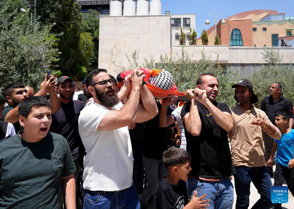 People carry the body of Ahmed Sultan killed by Israeli soldiers during clashes in Al-Bireh city in the central West Bank, on July 16, 2024. A Palestinian man was shot dead on Tuesday by the Israeli army during a raid in the central West Bank, Palestinian sources said, while Israeli sources accused him of trying to carry out a stabbing attack against soldiers. (Photo by Nidal Eshtayeh/Xinhua)