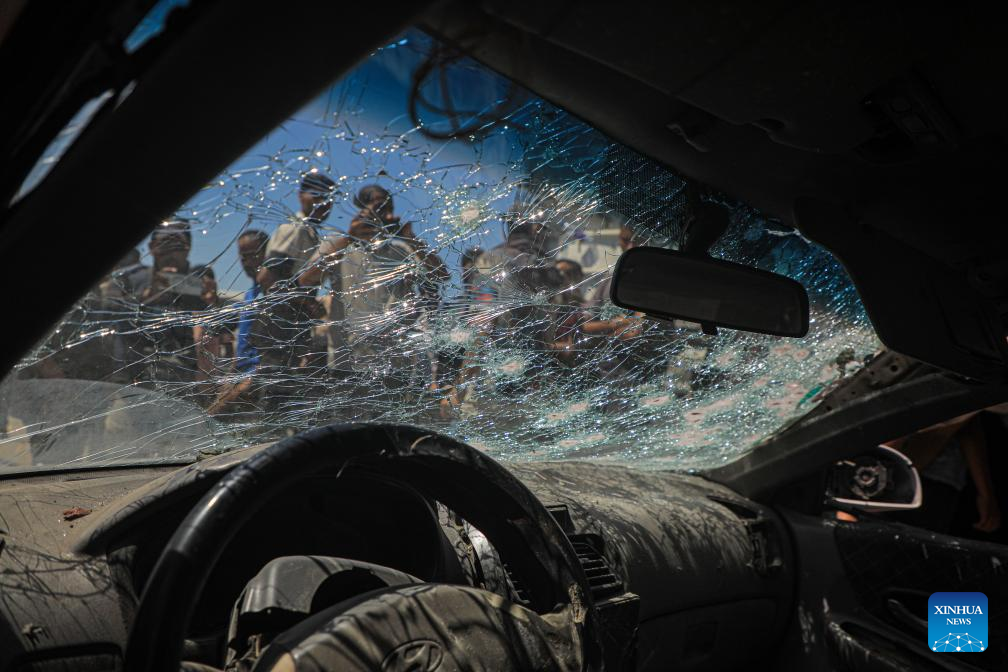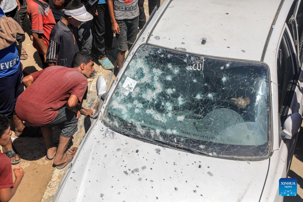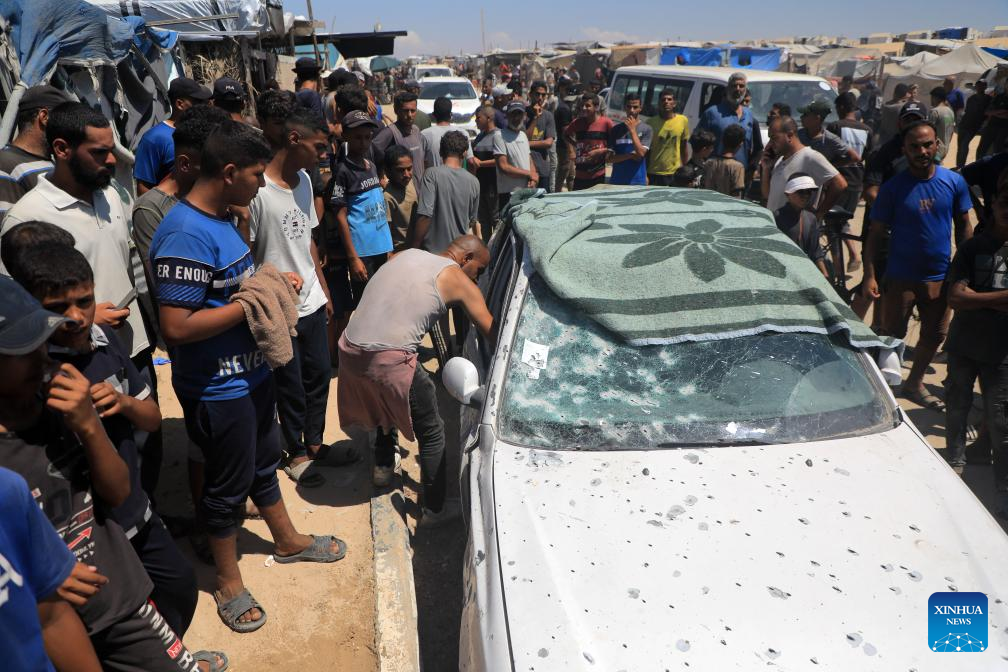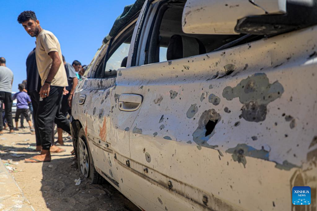 Palestinian people inspect a damaged car following an Israeli attack in the al-Mawasi area in the southern Gaza Strip city of Khan Younis, on July 16, 2024. The Israeli army committed a "terrible massacre" against the displaced in Al-Mawasi, killing 17 Palestinians and wounding more than 26 others, the Gaza-based health authorities said in a statement on Tuesday. (Photo by Rizek Abdeljawad/Xinhua)