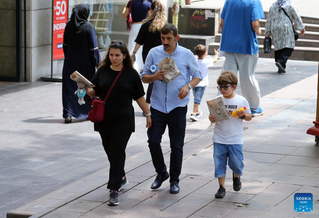 People walk on a street in Ankara, Türkiye, July 17, 2024. Turkish consumers are avoiding high-cost purchases and instead concentrating on bargain-shopping for necessities, hoping that decreasing inflation will improve their living standards.