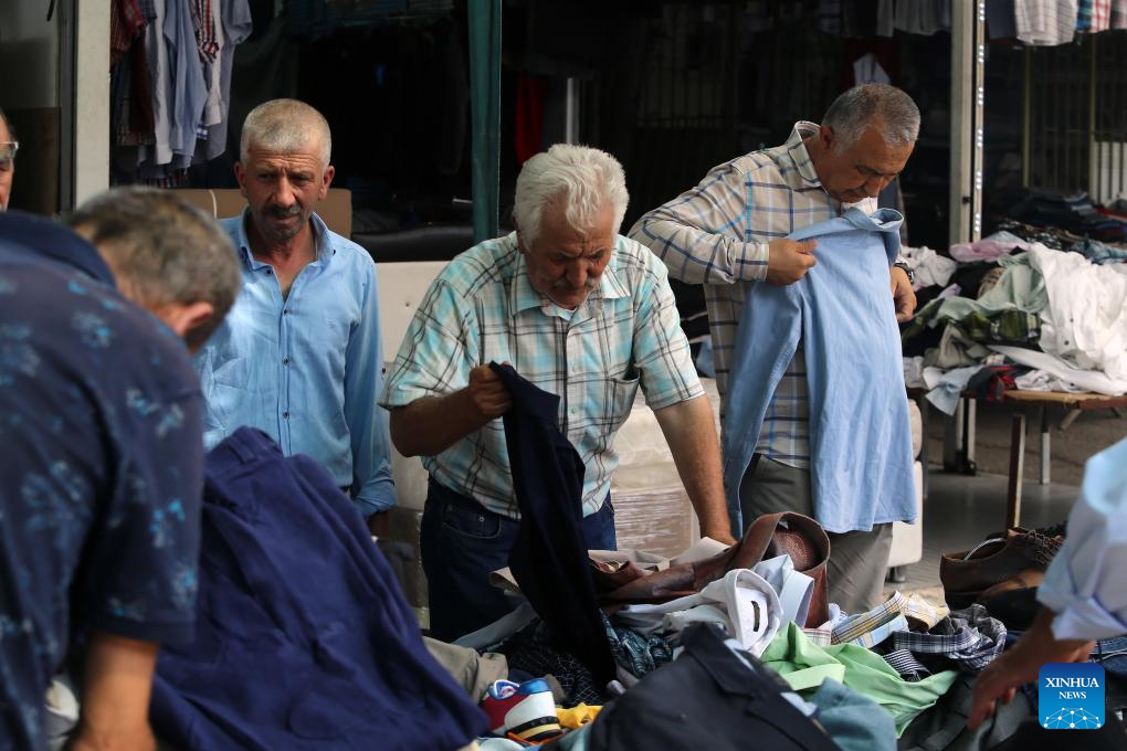 People shop at a second-hand market in Ankara, Türkiye, July 17, 2024. Turkish consumers are avoiding high-cost purchases and instead concentrating on bargain-shopping for necessities, hoping that decreasing inflation will improve their living standards.