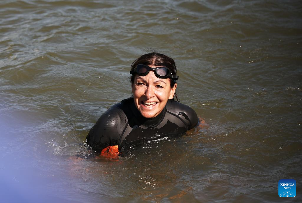 Mayor of Paris Anne Hidalgo swims in the Seine River less than 10 days before the opening of the Paris 2024 Olympic Games in Paris, France, July 17, 2024. (Xinhua/Gao Jing)