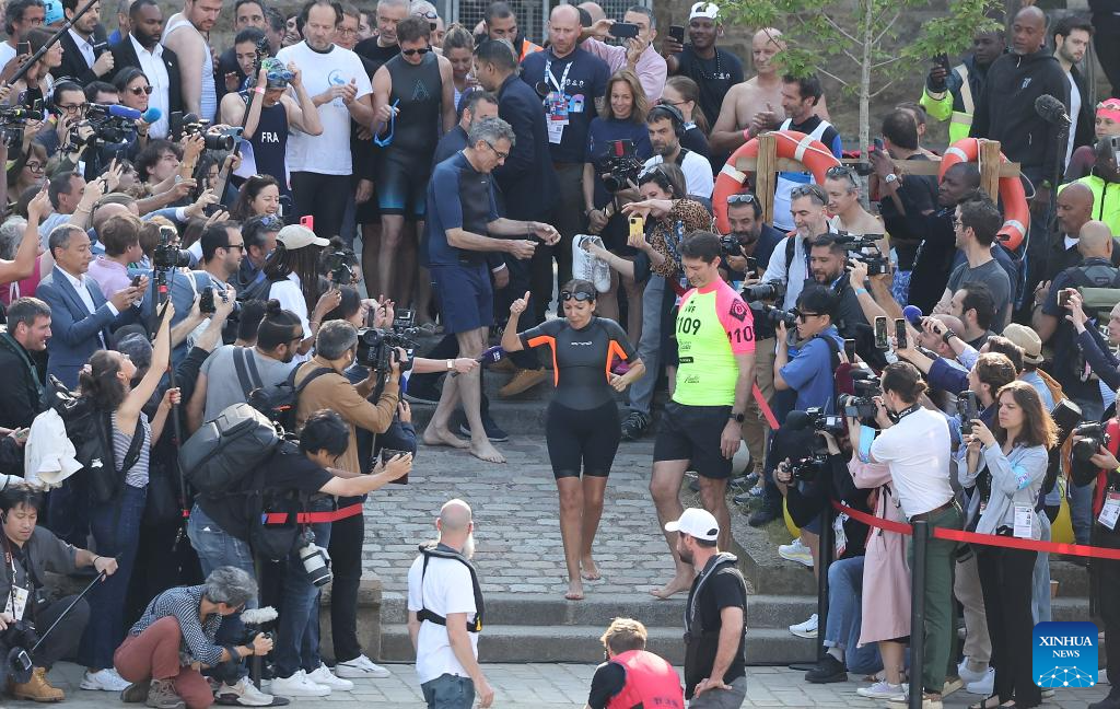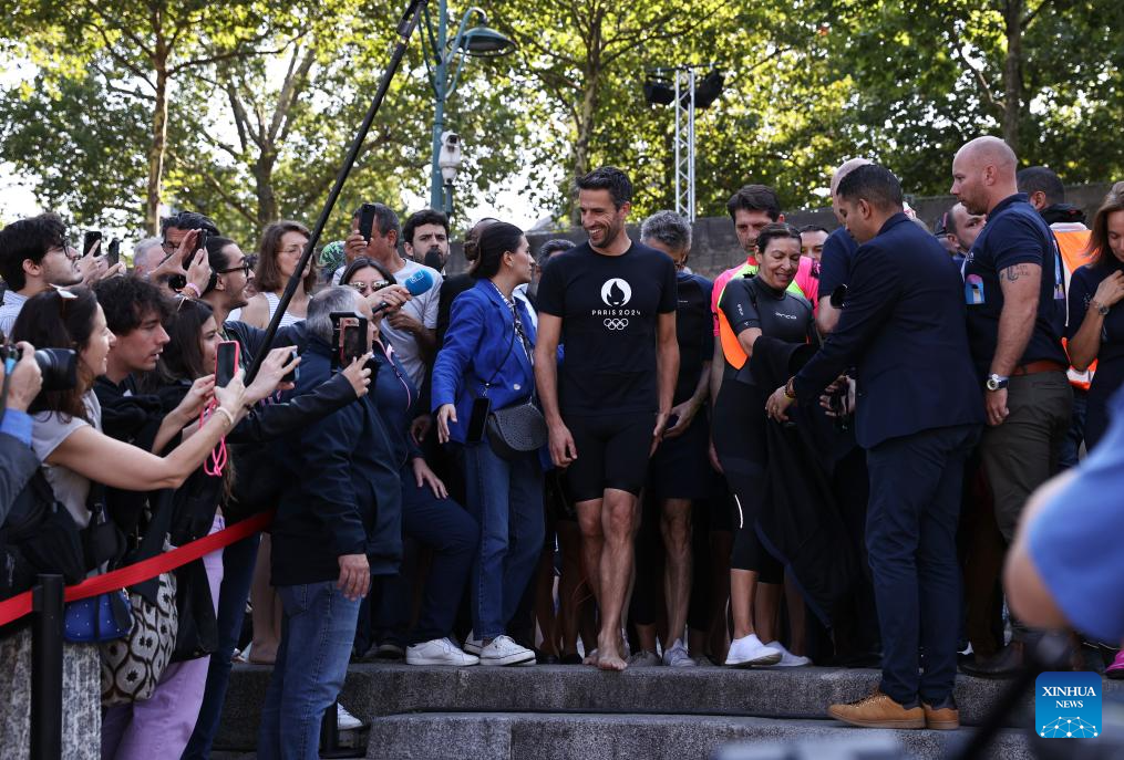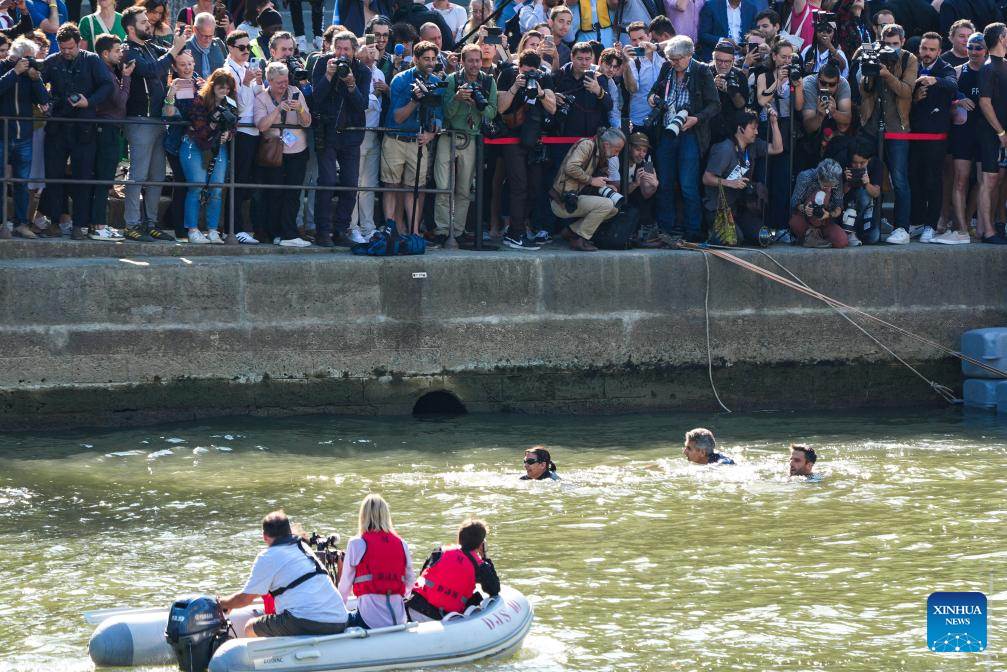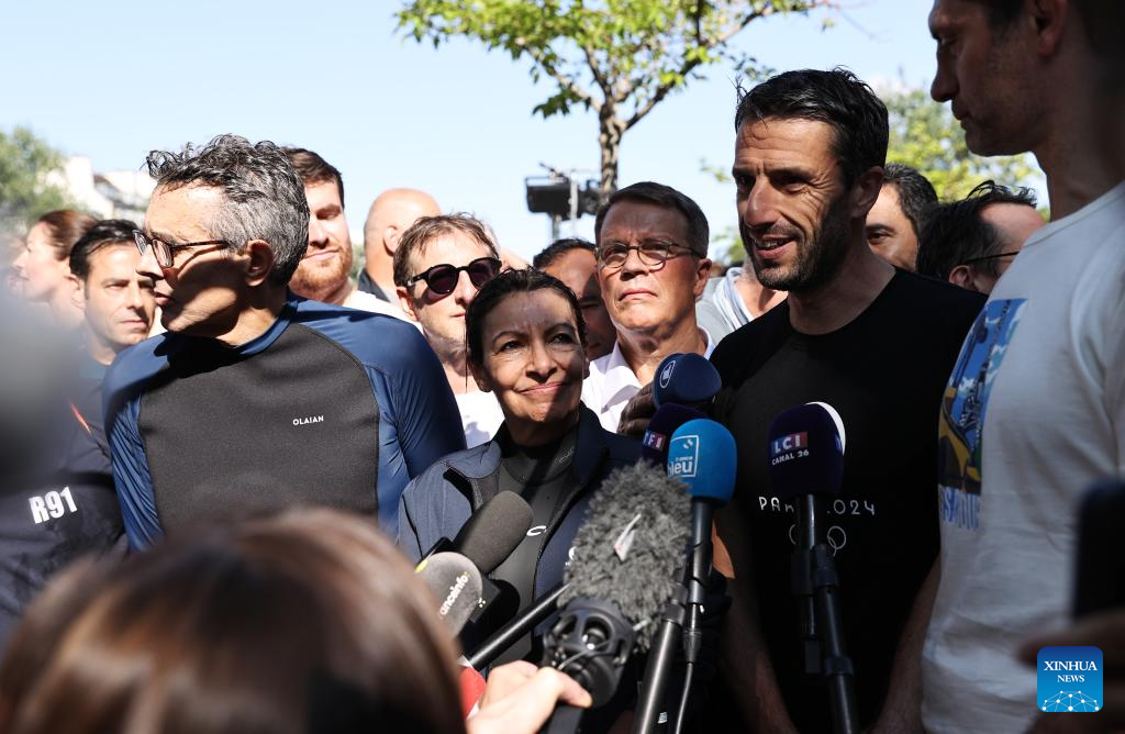 Mayor of Paris Anne Hidalgo (C) and Paris 2024 Olympics and Paralympics Organizing Committee president Tony Estanguet receive interviews after swimming in the Seine River less than 10 days before the opening of the Paris 2024 Olympic Games in Paris, France, July 17, 2024. (Xinhua/Gao Jing)