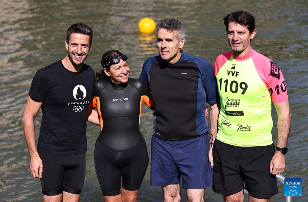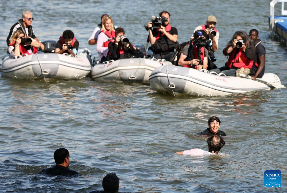 Mayor of Paris Anne Hidalgo and Tony Estanguet, Paris 2024 Olympics and Paralympics Organizing Committee president, swim in the Seine River less than 10 days before the opening of the Paris 2024 Olympic Games in Paris, France, July 17, 2024. (Xinhua/Xu Chang)