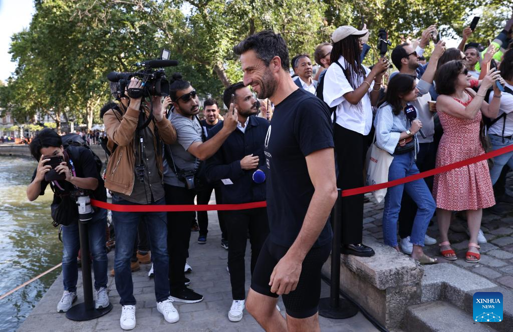 Paris 2024 Olympics and Paralympics Organizing Committee president Tony Estanguet prepares before swimming in the Seine River less than 10 days before the opening of the Paris 2024 Olympic Games in Paris, France, July 17, 2024. (Xinhua/Gao Jing)