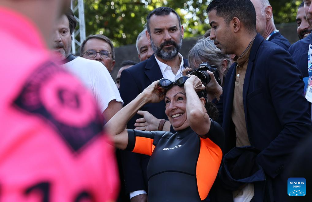 Mayor of Paris Anne Hidalgo (C) prepares before swimming in the Seine River less than 10 days before the opening of the Paris 2024 Olympic Games in Paris, France, July 17, 2024. (Xinhua/Cao Can)