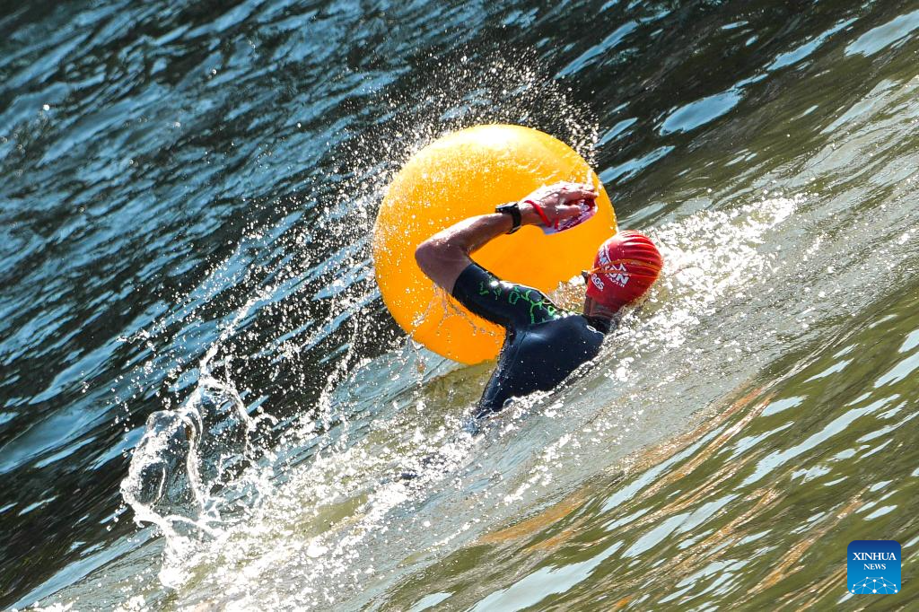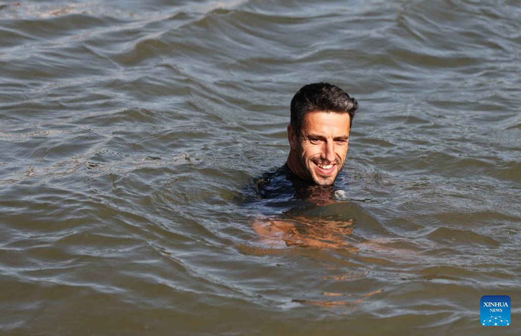 President of the Paris 2024 Organizing Committee Tony Estanguet swims in the Seine River less than 10 days before the opening of the Paris 2024 Olympic Games in Paris, France, July 17, 2024. (Xinhua/Gao Jing)