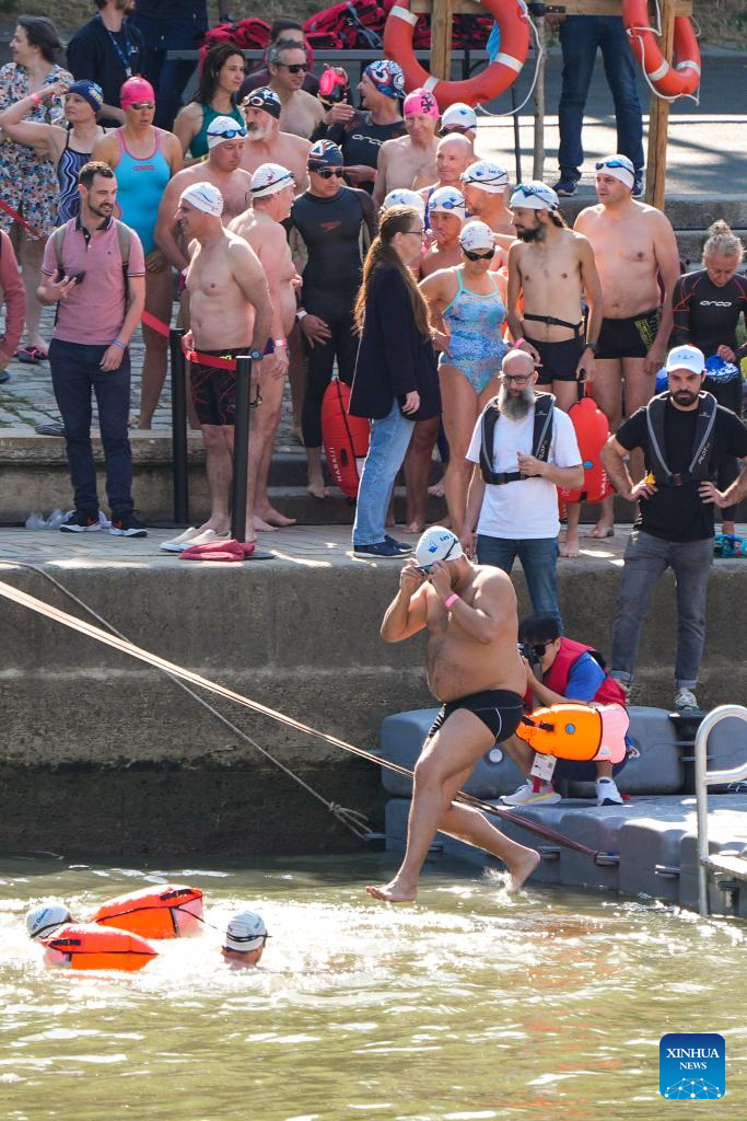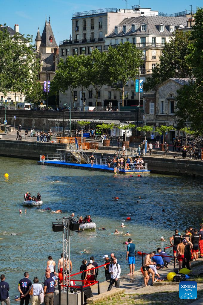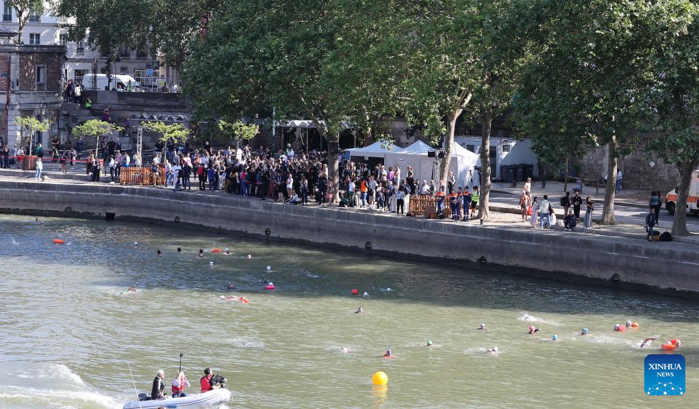 Local residents swim in the Seine River after the mayor of Paris swam in the river to demonstrate that it is clean enough to host the outdoor swimming events at the Paris Olympics later this month in Paris, France, on July 17, 2024. (Xinhua/Cao Can)