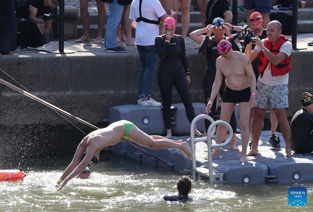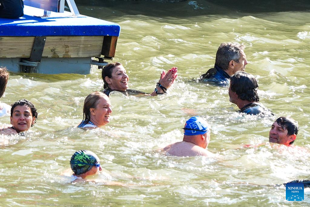 Local residents swim in the Seine River after the mayor of Paris swam in the river to demonstrate that it is clean enough to host the outdoor swimming events at the Paris Olympics later this month in Paris, France, on July 17, 2024. (Xinhua/Xu Chang)