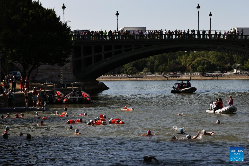 Local residents swim in the Seine River after the mayor of Paris swim in the river to demonstrate that it is clean enough to host the outdoor swimming events at the Paris Olympics later this month in Paris, France, on July 17, 2024. (Xinhua/Gao Jing)