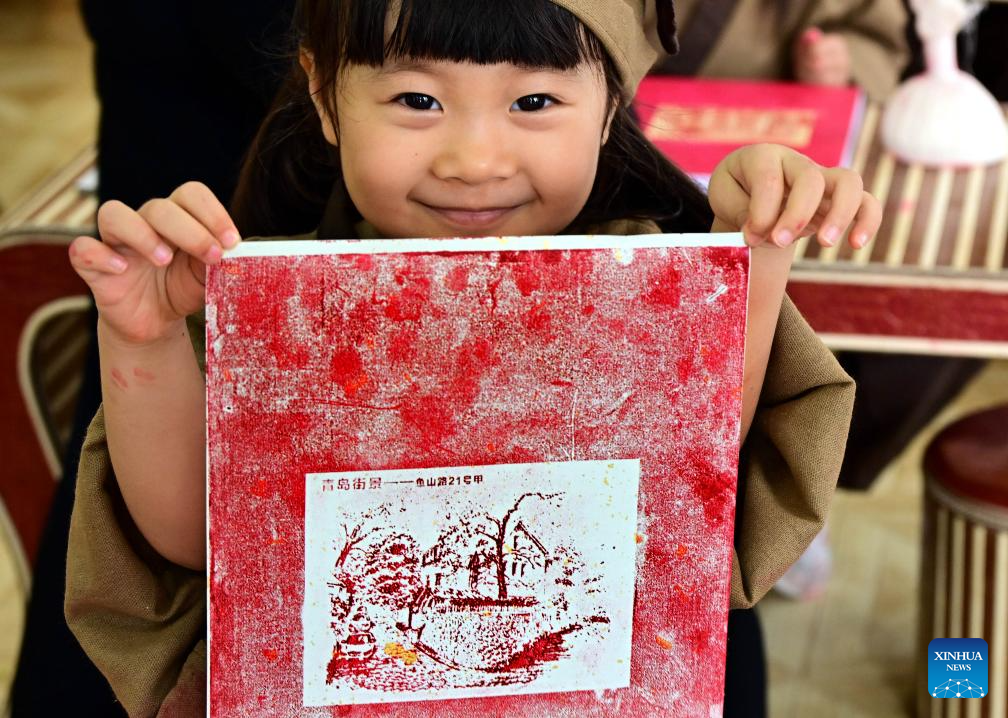 A girl shows her rubbing work at an art space themed on Chinese culture in Qingdao, east China's Shandong Province, July 19, 2024. The art space held experience activities on traditional rubbing techniques for children during the summer vacation. (Xinhua/Li Ziheng)