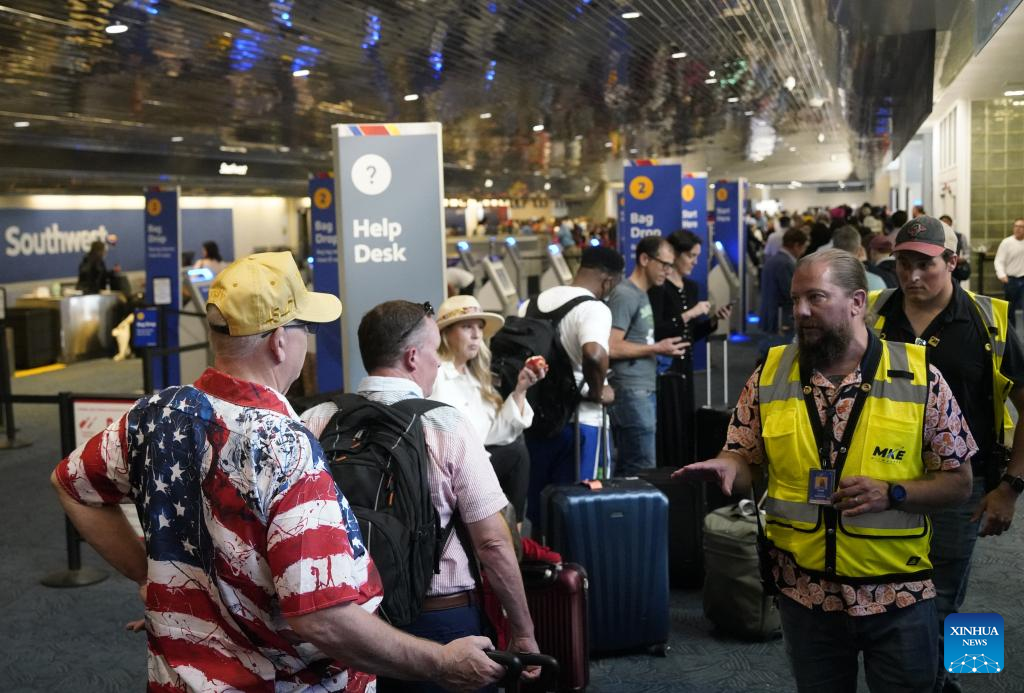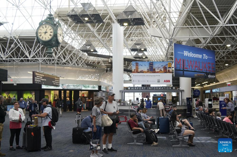 Passengers wait at Milwaukee Mitchell International Airport in Milwaukee, Wisconsin, the United States, on July 19, 2024. Multiple U.S. airlines said their flights would be delayed or canceled on Friday due to technical issues involving cybersecurity giant CrowdStrike and Microsoft. (Xinhua/Wu Xiaoling)